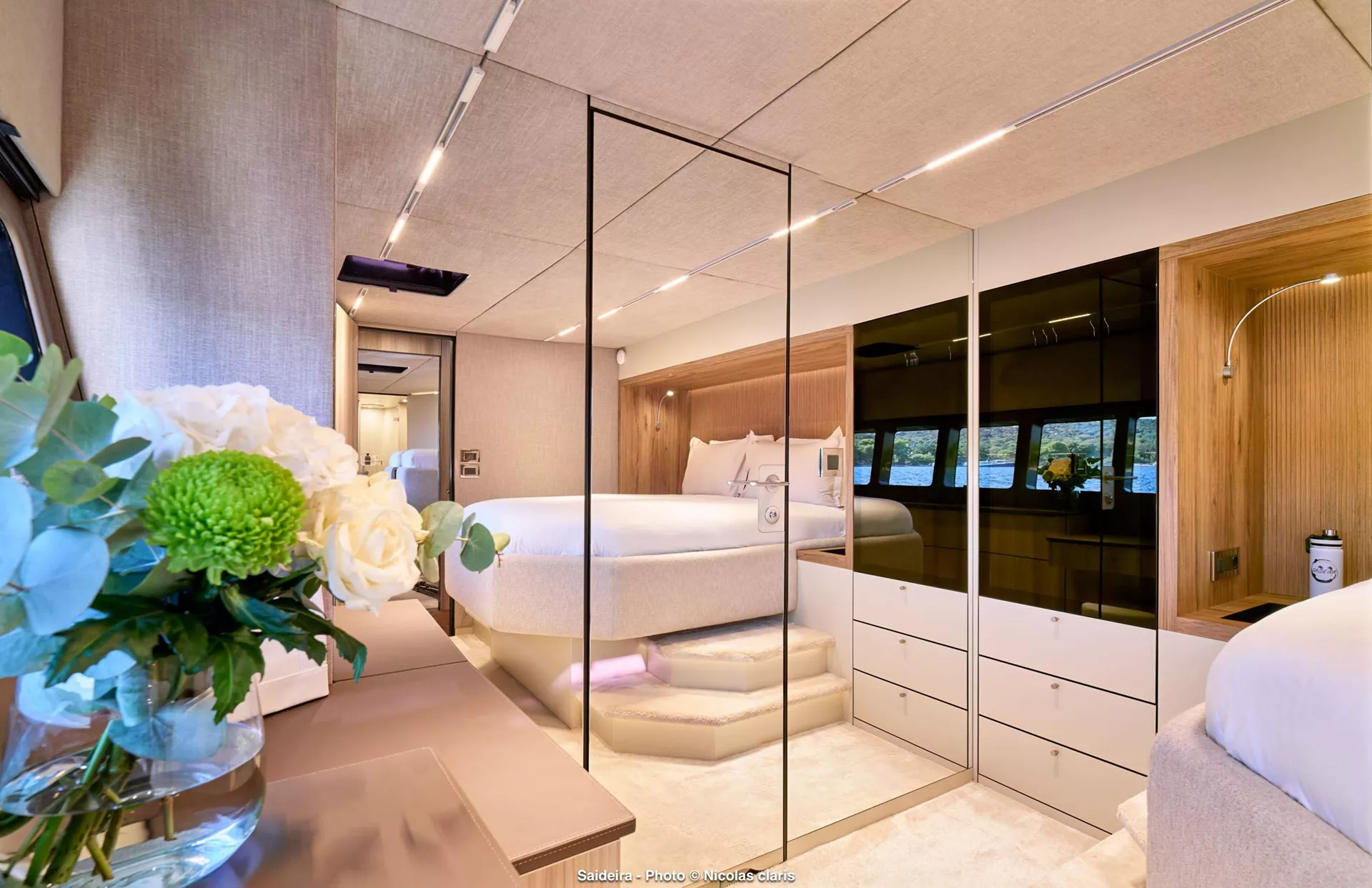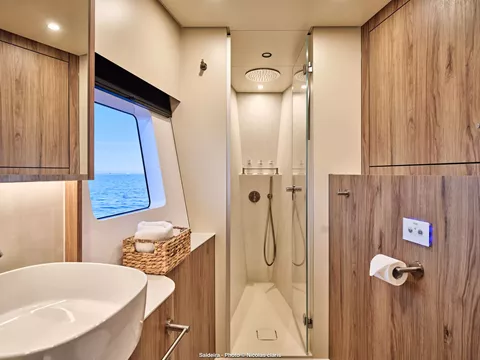 The generously sized saloon, featuring a sofa and dining table, creates a welcoming and elegant atmosphere. With direct access to both the front and aft decks, passengers can seamlessly enjoy the breathtaking views of the surrounding ocean. The large flybridge further enhances the vessel's appeal, providing additional seating, a bar, and a dining area, allowing guests to relax and unwind in style.