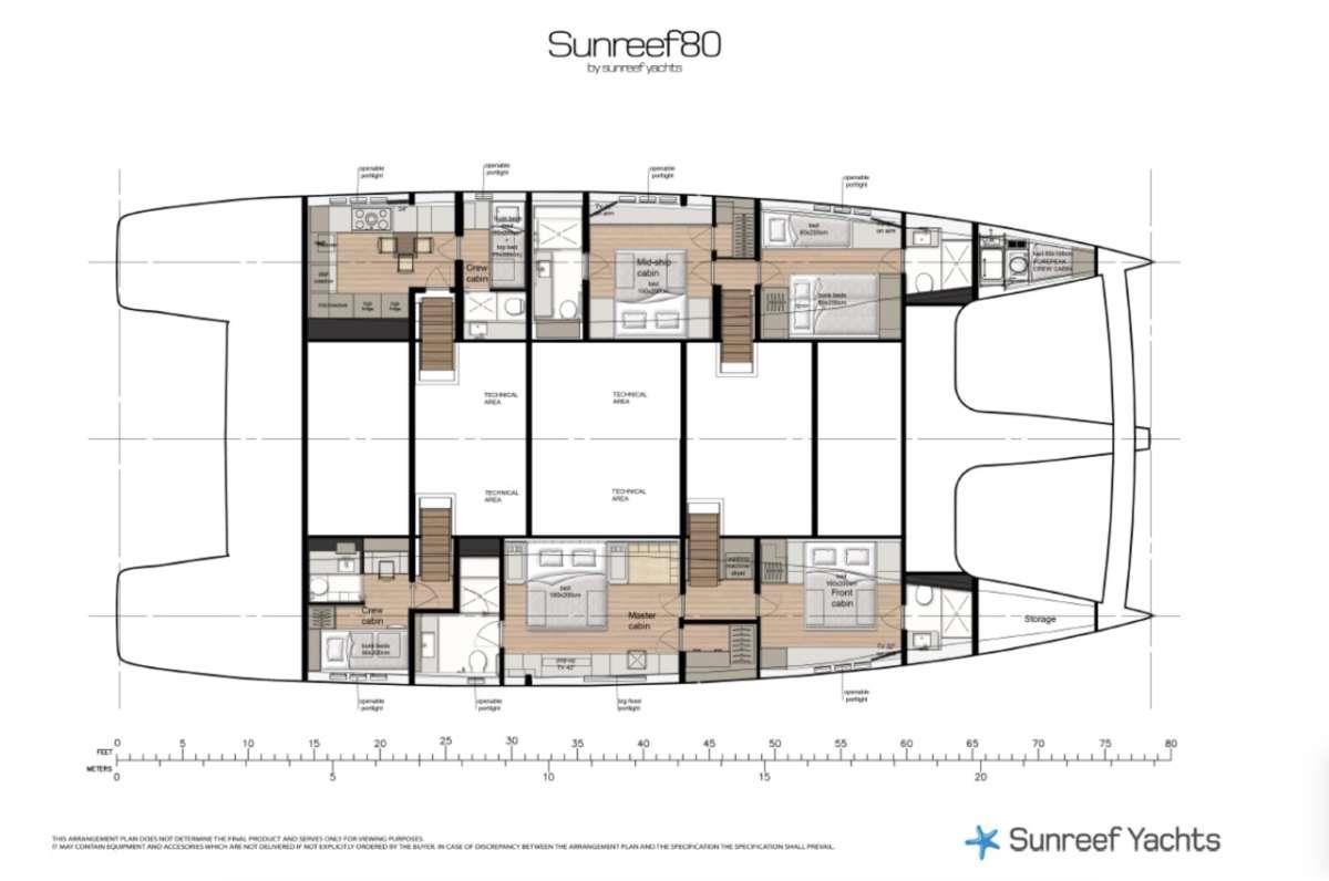 The master cabin is located in the middle of the starboard side and has a king-size bed, a small sofa for relaxing, a dressing table and a walk-in wardrobe. The bathroom with shower is very spacious. Also to starboard is the double cabin (queen size bed) with a comfortable en suite bathroom.