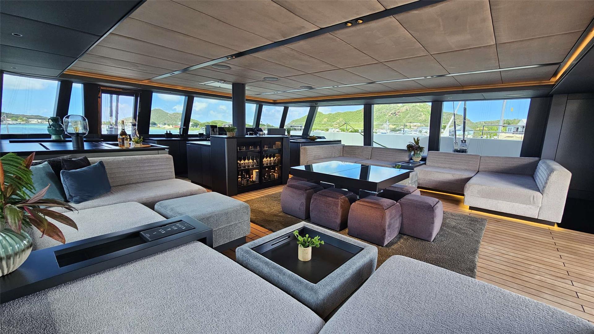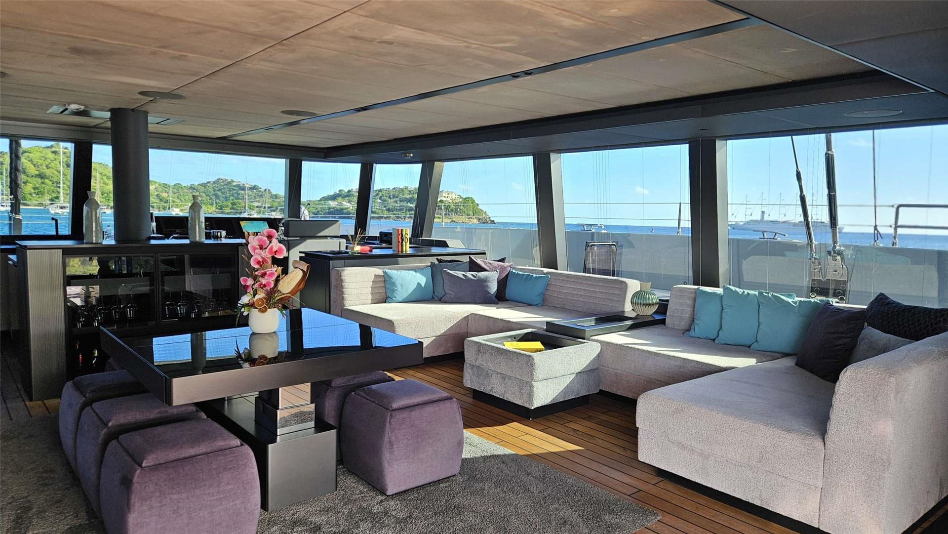 The aft deck has a large dining table that can seat up to 10 people and a lounge sofa. There is also a lounge with a coffee table on the foredeck.