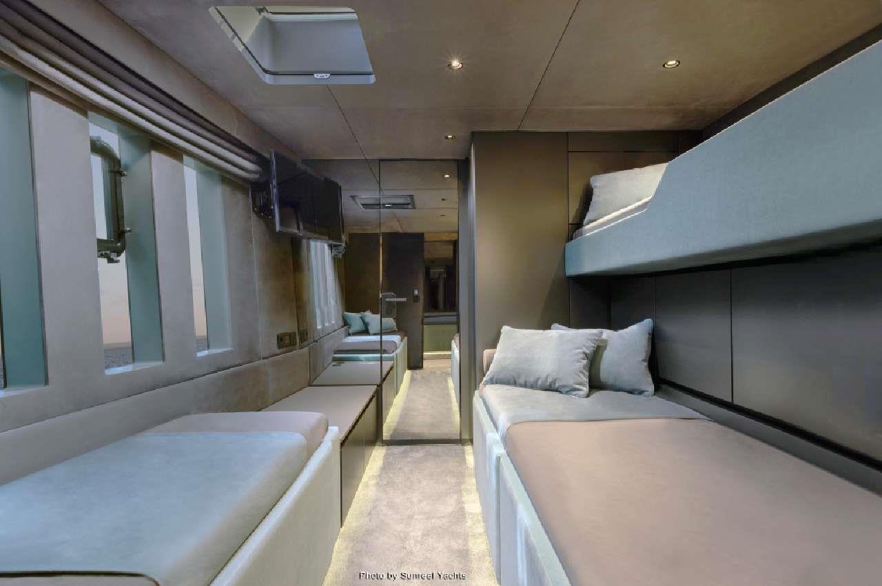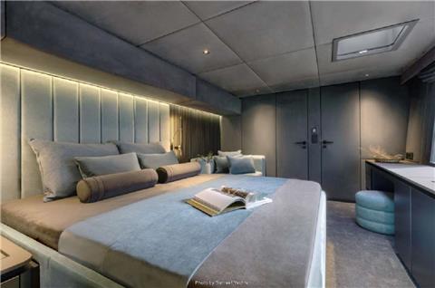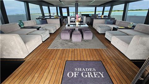 On the flybridge, the SHADES OF GREY has another large dining table, perfect for up to 10 guests, with a U-shaped seating area. Behind this is a full width sunbathing area. Forward of the helm position is an attractive bar, where you can enjoy a drink or have a snack from the chef.