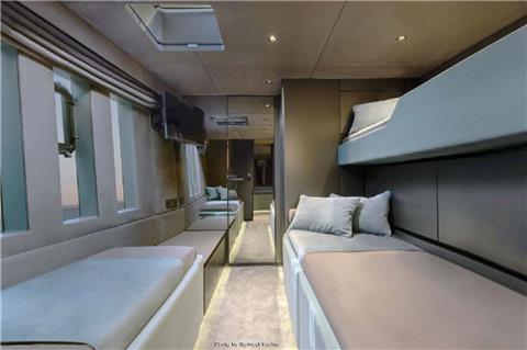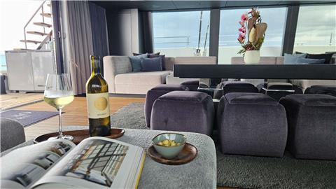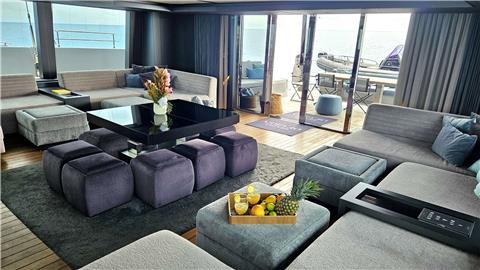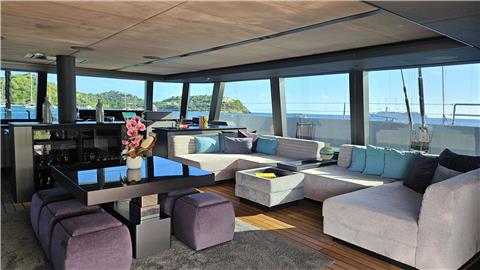 The saloon is all about relaxing together, with two really big lounge sofas. In the centre is a black glass table that can be converted into a dining table for up to 10 people in bad weather.