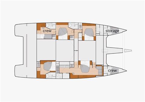 The Blue Dream accommodates 8 people in 4 double cabins, each offering a comfortable and elegant atmosphere, with private bathrooms and air conditioning with private control: the main cabin with king size bed, desk, bathroom, TV and two access points (one from the lounge and one from the forward deck), and 3 double cabins with queen beds.