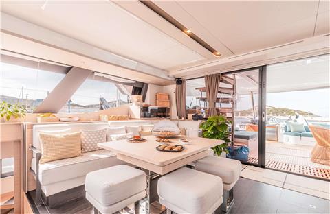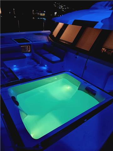 Her outdoor area with a spacious flybridge, a seawater jacuzzi on the forward deck and a rear cockpit welcoming the dining area, invites you to relax and enjoy.