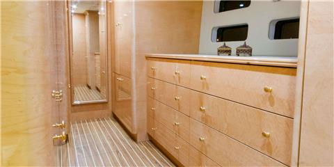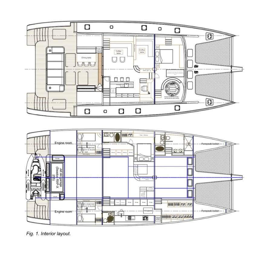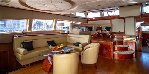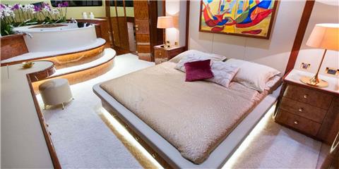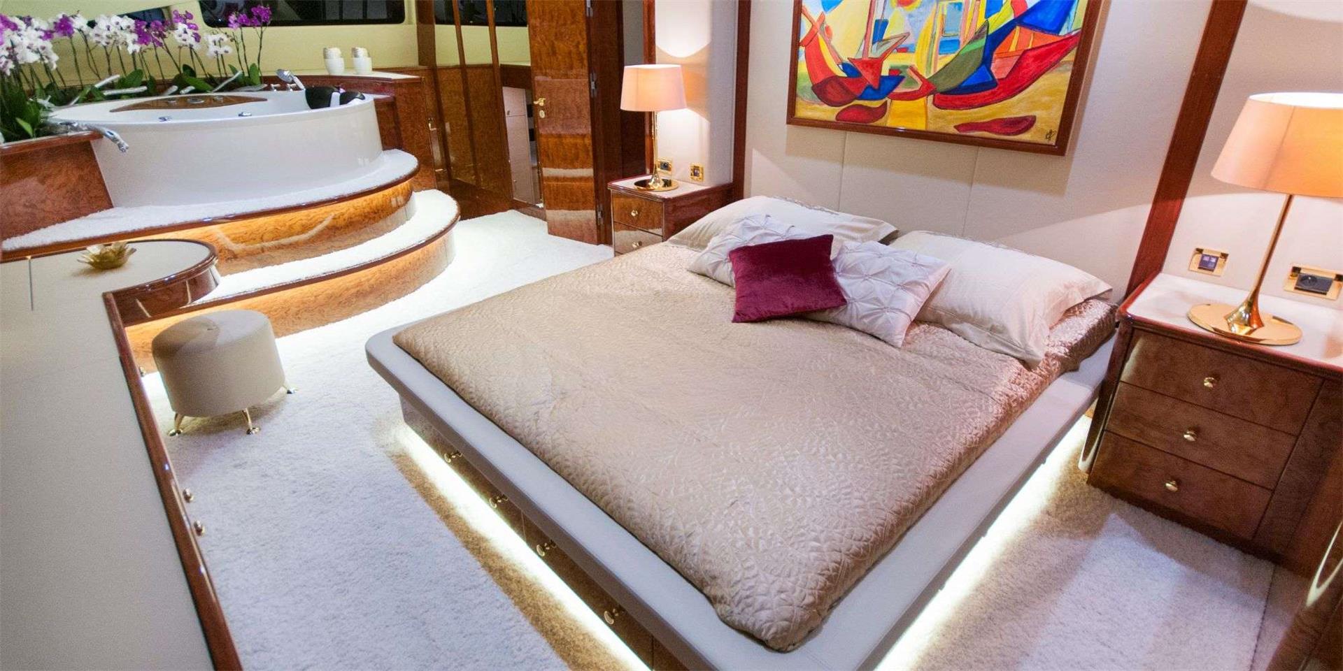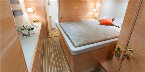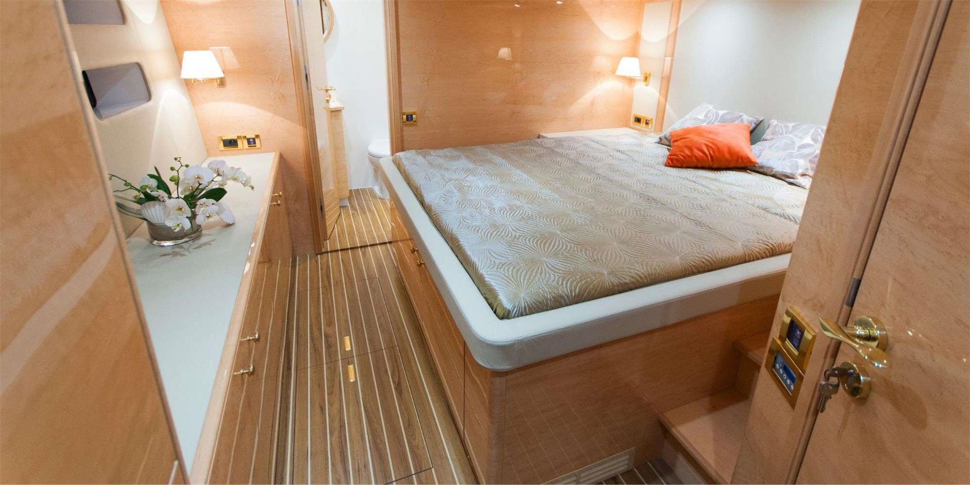 Ensuite master’s cabin equipped with a jacuzzi, a queen cabin, and one guest twin cabin convertible to a double cabin with an additional pullman bed.