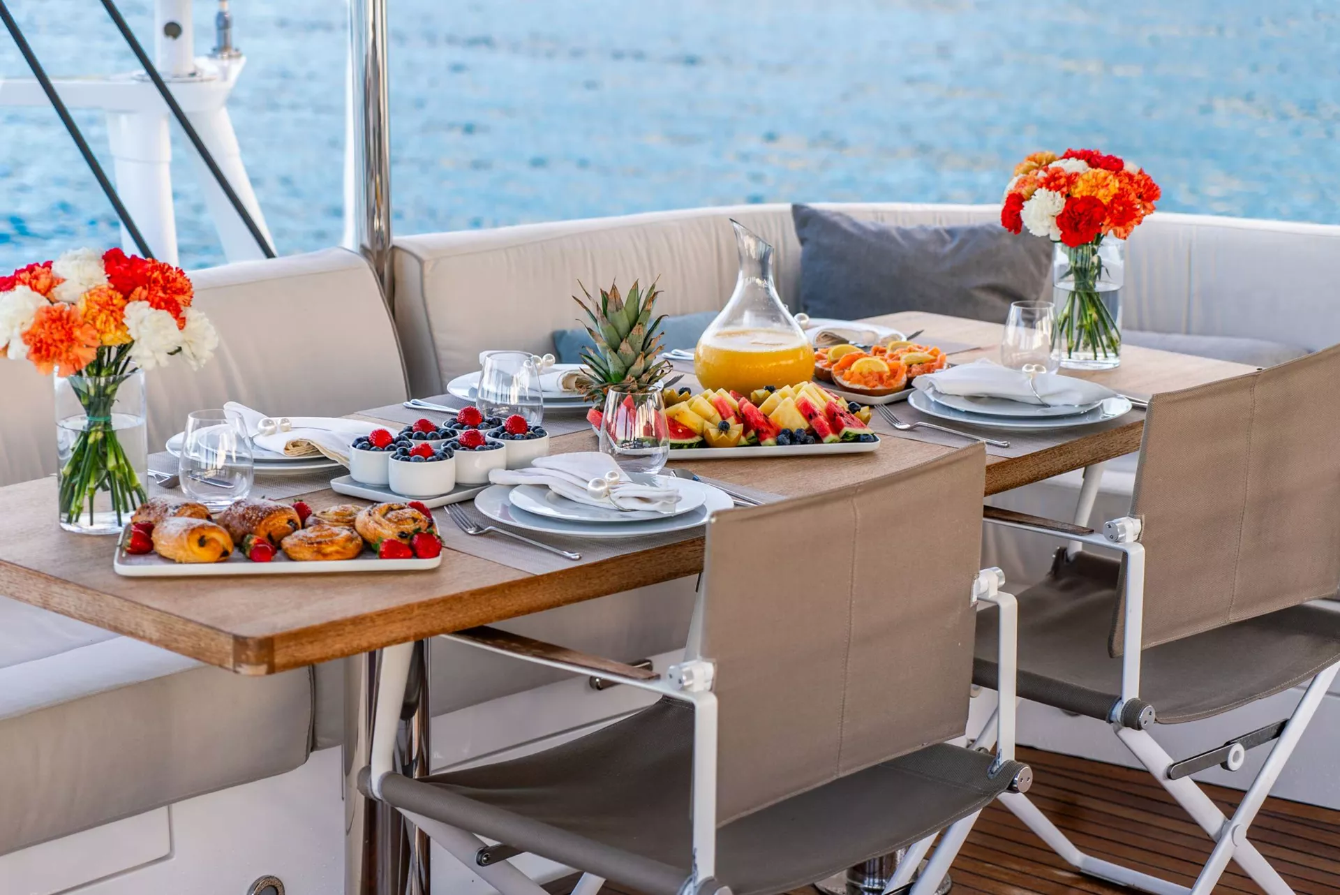 She can accommodate up to 9 guests sleeping on board. The full beam Master Stateroom with its panoramic view includes a private access to the forward deck, with a serene corner lounging area. Also included is a 3 single bed stateroom, perfect for the kids, and 2 more double bed VIP staterooms. All staterooms have ensuite bathroom. The forward part is dedicated to the crew with the captain’s cabin, a twin cabin, a large galley with crew mess.