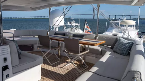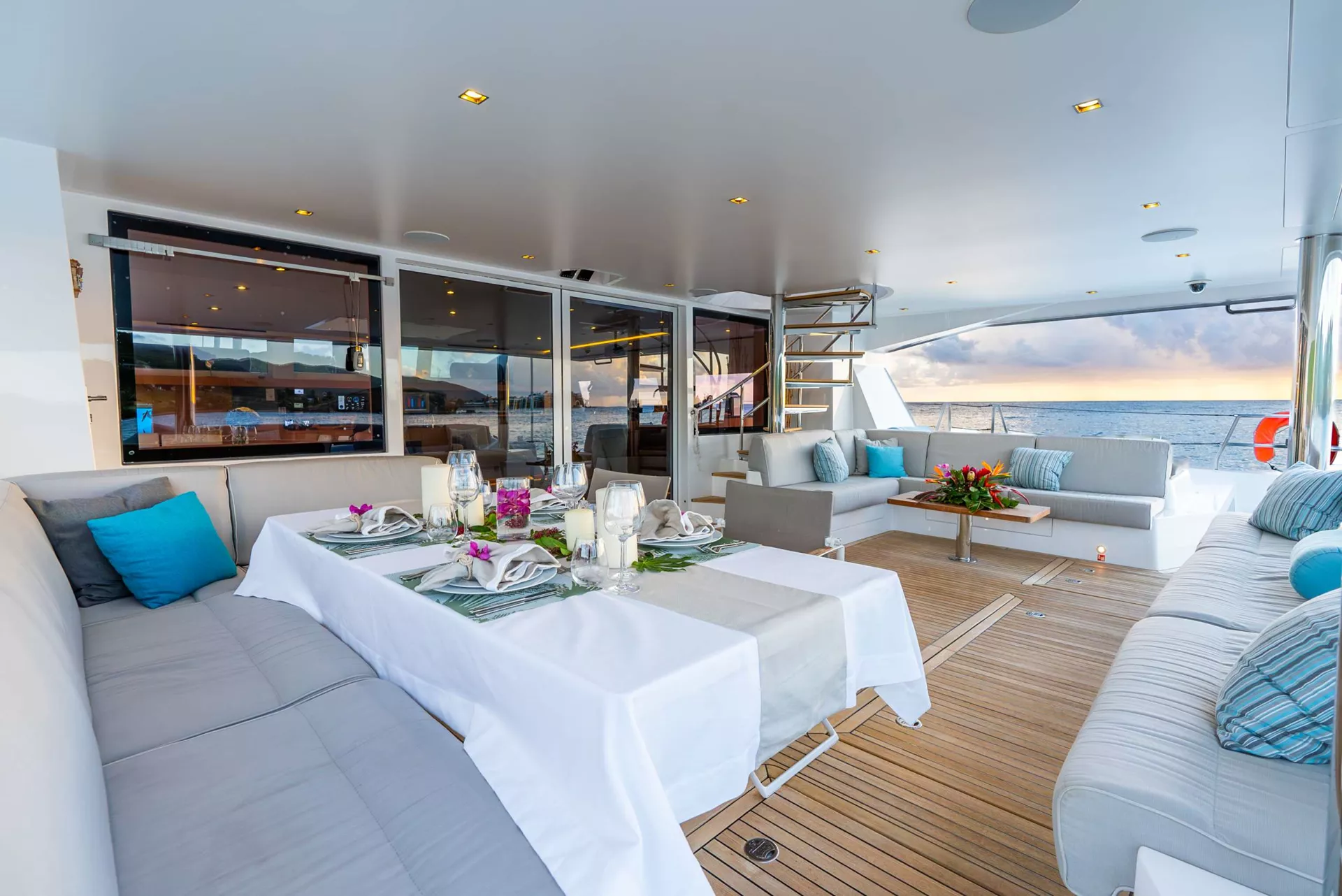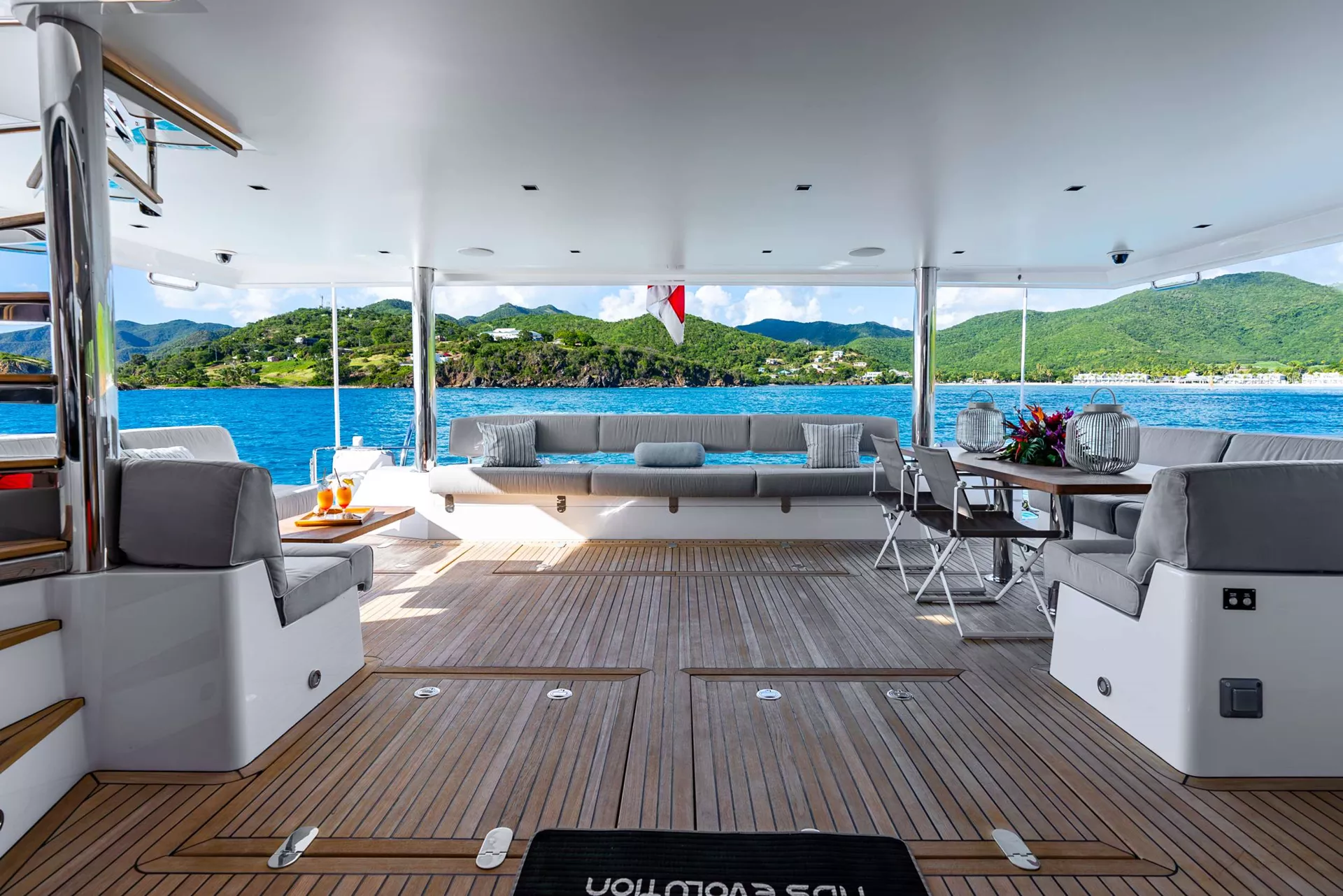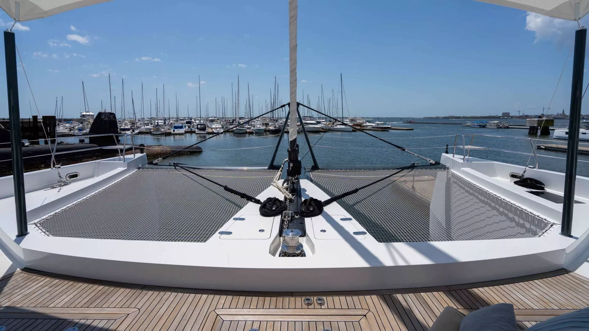 Outdoor living is equally impressive. The expansive flybridge delivers sweeping 360-degree views, ideal for sunset cocktails or relaxed afternoons underway. Forward, trampoline sunpads provide a front-row seat to the elements, whether basking in warm Caribbean sunshine or enjoying a crisp evening beneath polar skies.
