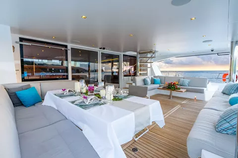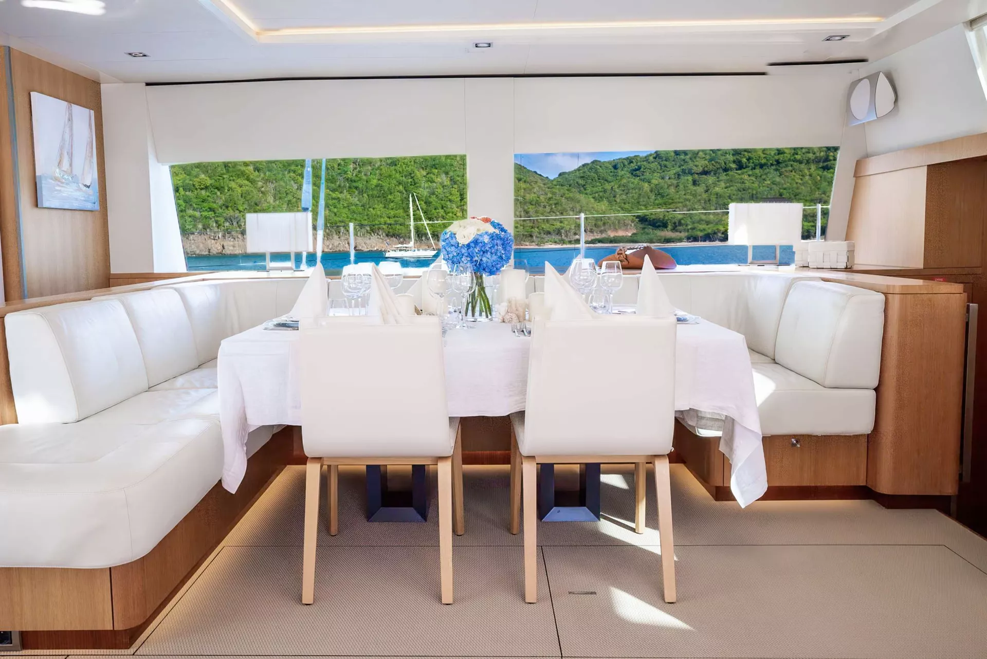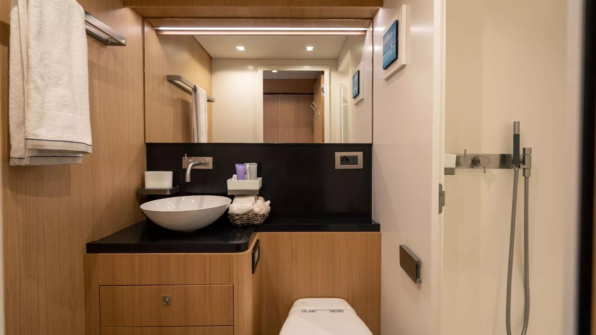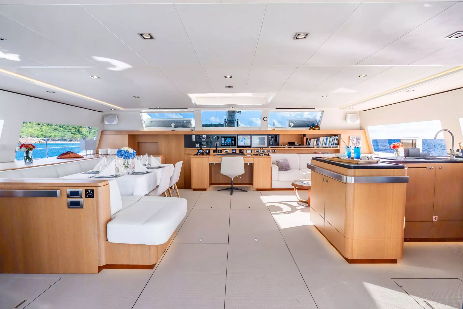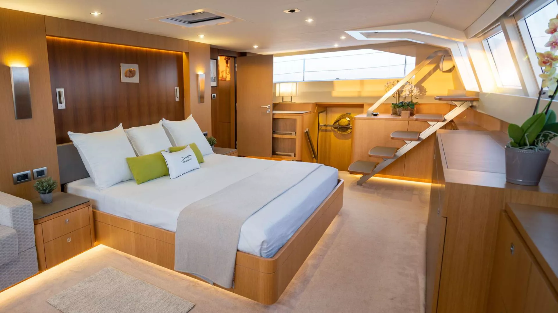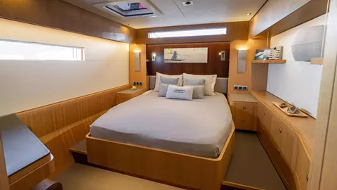 Her interior features a bright, contemporary open layout that feels both welcoming and sophisticated. Below deck, she accommodates up to nine guests in four thoughtfully designed staterooms. The full-beam Master suite offers panoramic views, a private office desk, a quiet lounging corner, and direct access to the forward deck, creating a private retreat at sea. Two double cabins and one triple cabin make her particularly well suited for families or mixed groups seeking flexibility without sacrificing comfort.