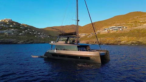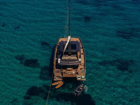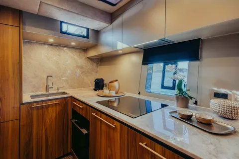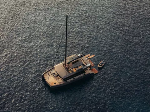 The Moon Yacht 60 – HONEYMOON is a brand-new 4-cabin catamaran docked at Kefalonia, Greece available for the Ionian islands. It accommodates up to 8 guests in double cabins and features 4 bathrooms with showers, a classic mainsail, electric winches, a generator, and GPS plotters. Modern amenities include a flat screen TV, heating, air conditioning, an audio system, and a DVD player. The fully-equipped, galley-down kitchen includes a microwave, ice maker, freezer, oven, and cooker, providing a luxurious and comfortable sailing experience.