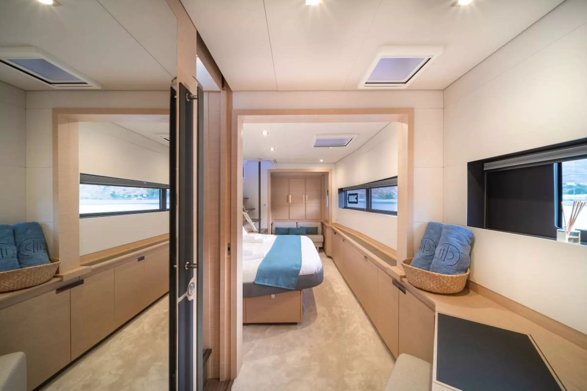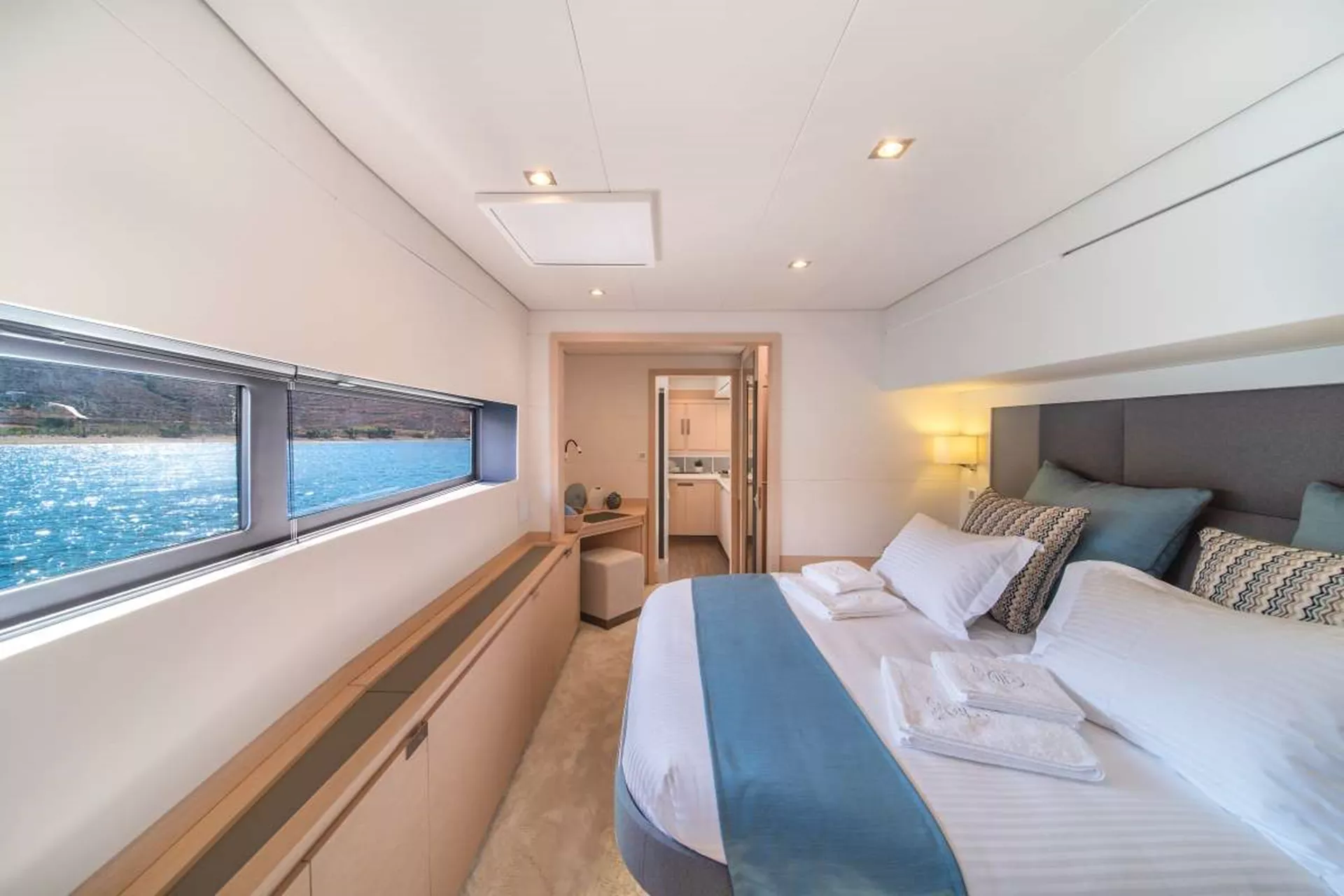 Her interior is stunningly modern and incredibly spacious, ensuring the utmost in comfort and luxury. She accommodates up to eight guests in four cabins, including one owner’s suite and three queen-bed cabins, each with a private bathroom. The flybridge and forward deck provide ample space for sunbathing and relaxation, while the aft cockpit is ideal for socializing and alfresco dining.