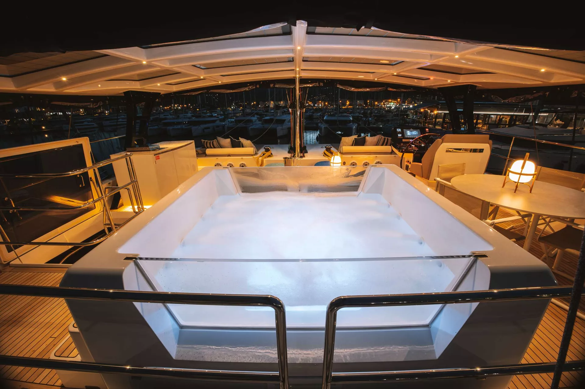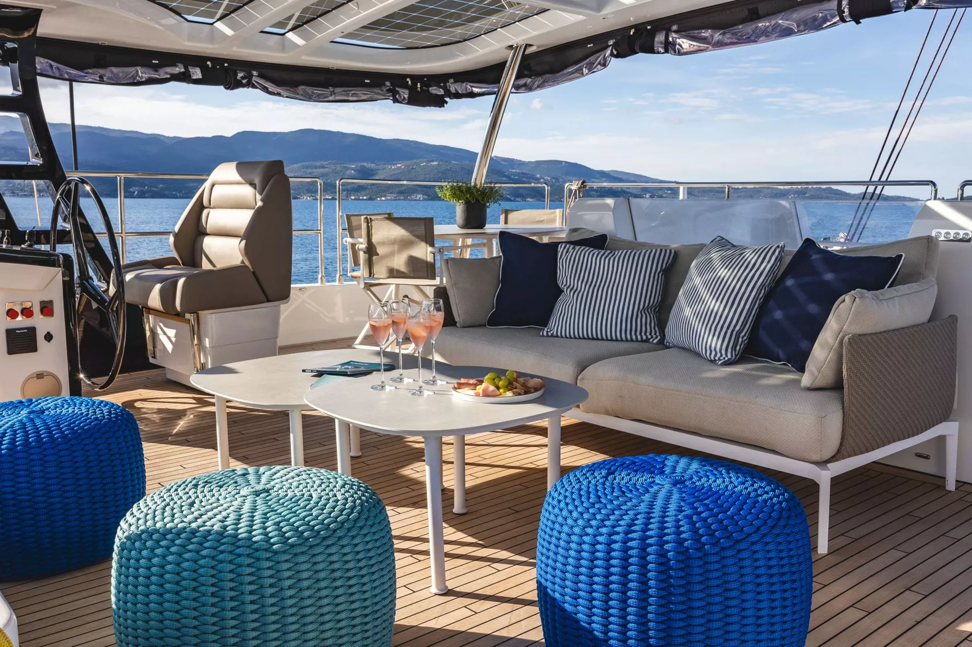 The exterior design of "MyMaria" is nothing short of captivating, with her custom blue hues evoking the vibrant essence of the Mediterranean. The expansive flybridge is a haven for indulgence, complete with a custom-designed four-seat Jacuzzi – a unique feature that adds a touch of decadence to every moment onboard. The open spaces, harmonious design, and beach-inspired aesthetic create an atmosphere of timeless sophistication, inviting guests to unwind in style.