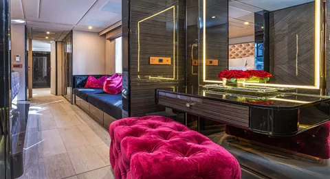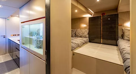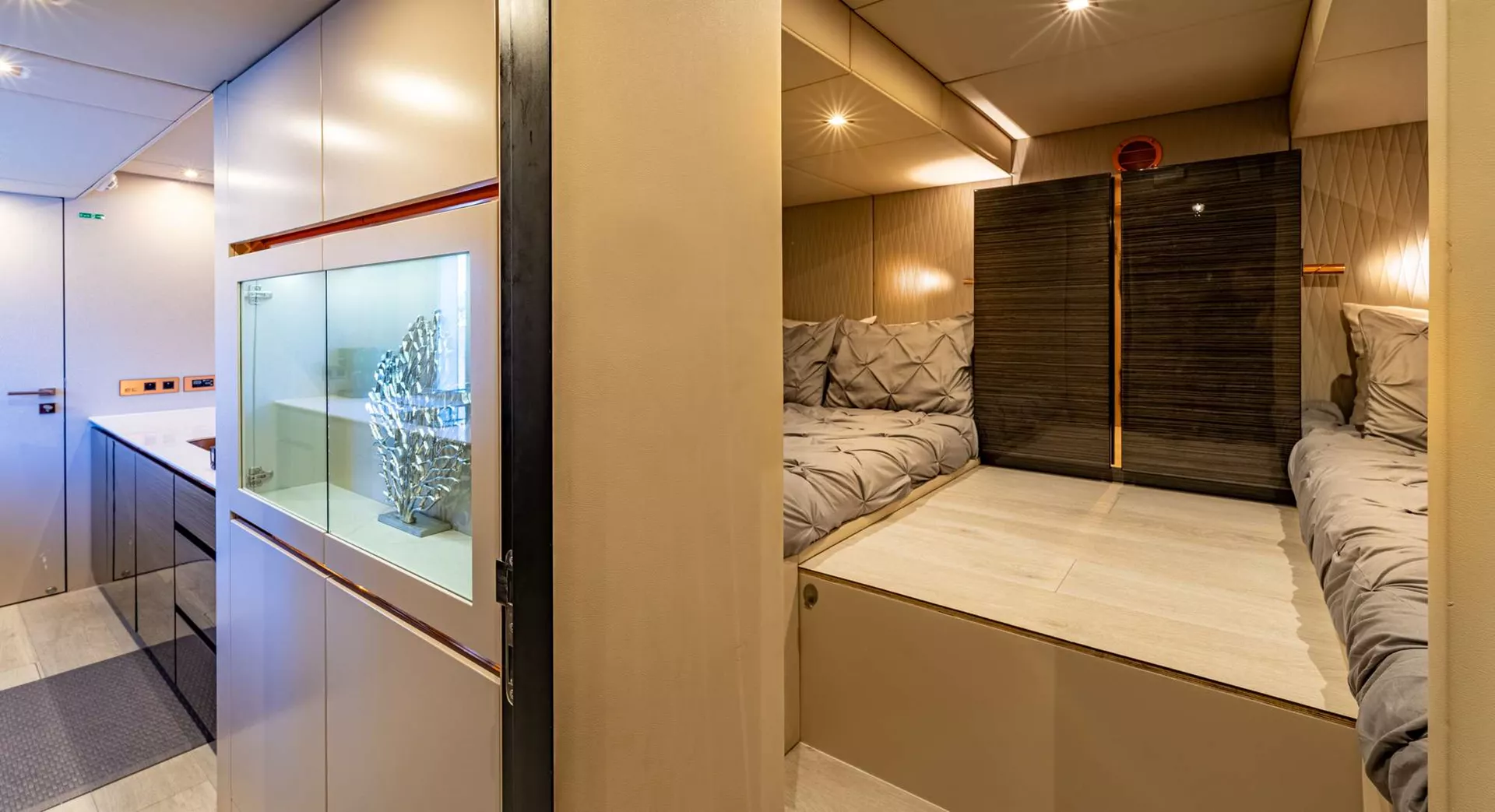 The Master Cabin is a haven of serenity and luxury, thoughtfully designed with bespoke furnishings to provide the perfect retreat for unwinding after a day of exploration and adventure.