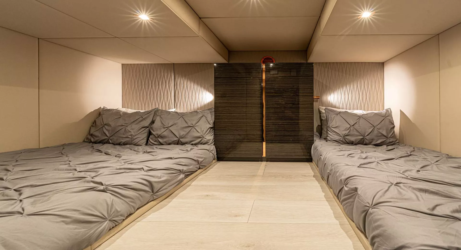 The VIP Cabin exudes modern sophistication and spacious comfort. Guests will enjoy its plush bedding, elegant decor, and a restful ambiance, making it an ideal choice for discerning charter guests.