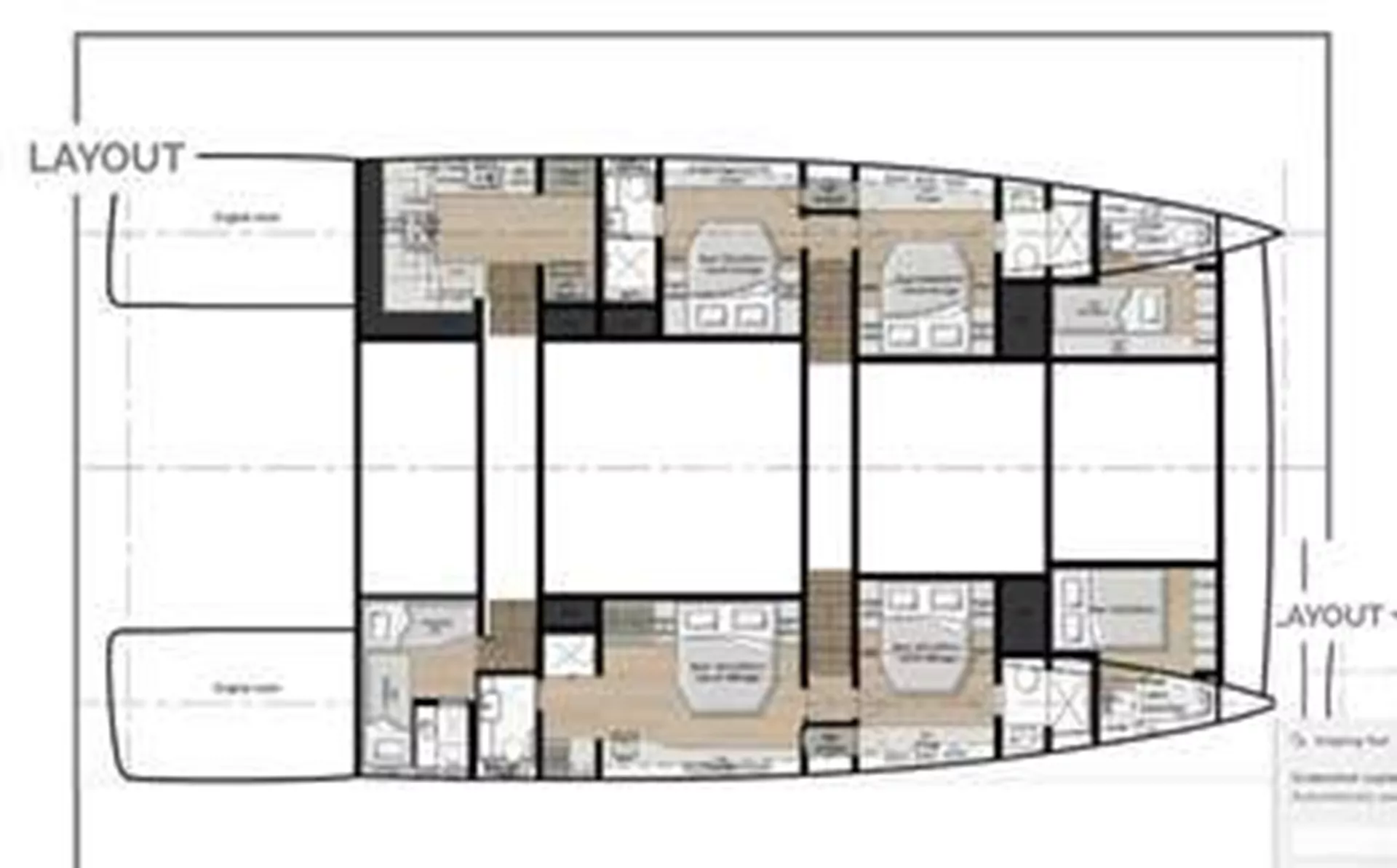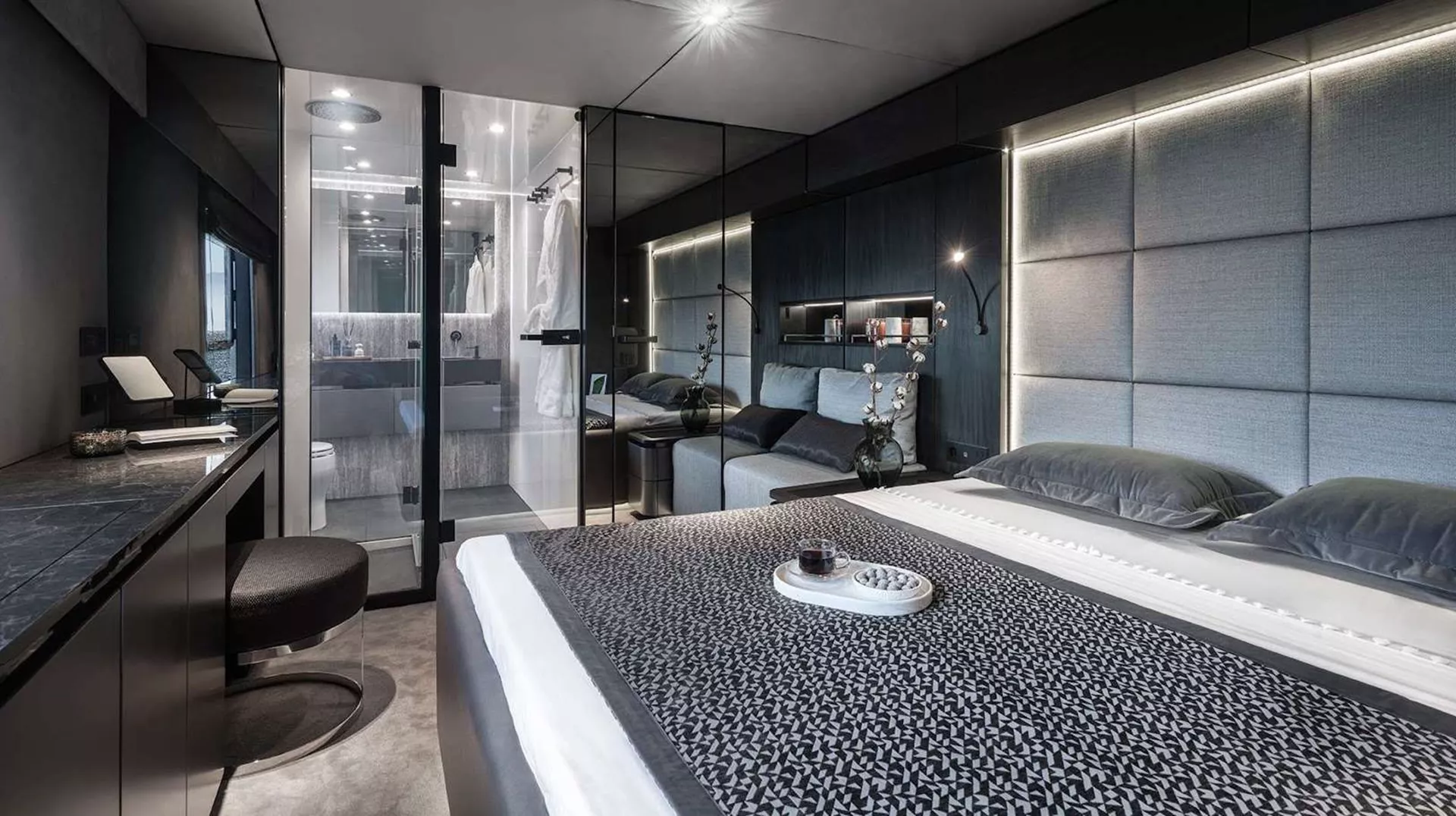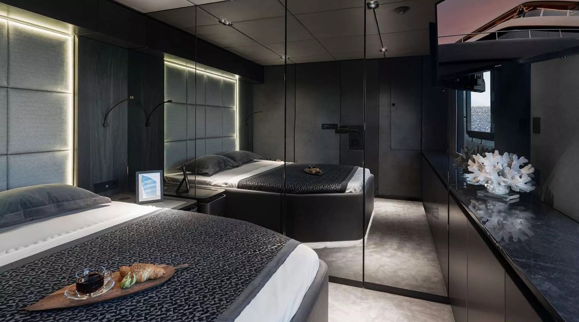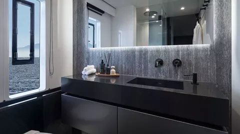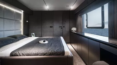 Her vast main deck saloon is a triumph of open-plan living, merging seamlessly with the aft cockpit to create a sweeping indoor–outdoor environment ideal for socializing, dining, and unwinding. Flooded with natural light from a large skylight, expansive panoramic glazing, and wide sliding doors, the saloon feels bright, airy, and intimately connected to the surrounding seascape. Every element of her interior is fully customizable, allowing for tailored layouts and finishes that elevate comfort and personalization to new heights.