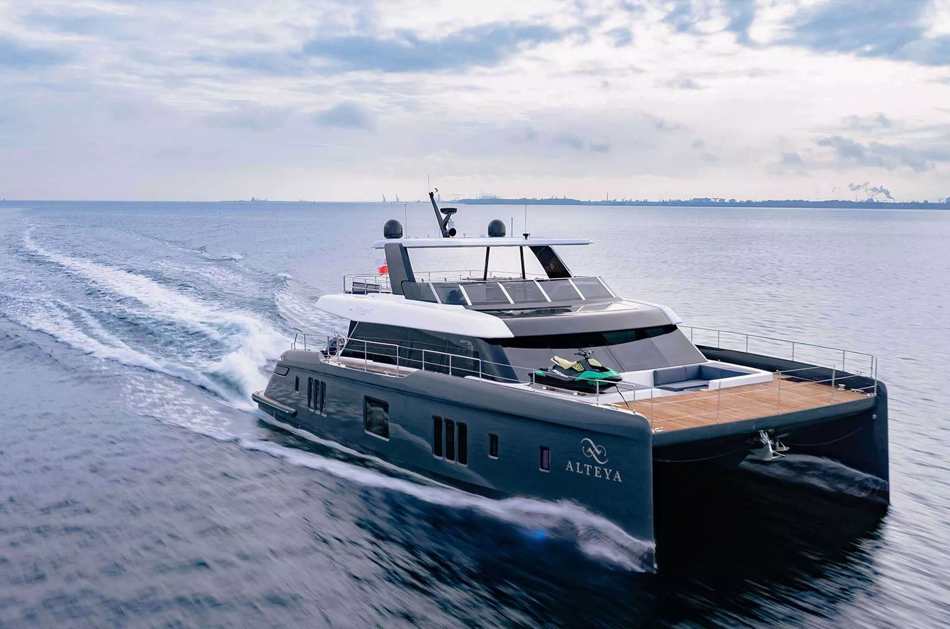 Below deck, the generous hull volumes offer remarkable flexibility, with thoughtfully designed accommodations and storage solutions that make extended cruising effortless. At the bow, Alteya’s spacious terrace invites guests to relax in luxurious freestanding furniture or retreat to the wind-protected lounge — a serene sanctuary perfect for morning coffees, sunset cocktails, or quiet reading hours. The aft cockpit, situated just above water level, serves as a delightful alfresco dining area and a convenient hub for watersports, offering immediate access to her impressive selection of toys and PWCs.