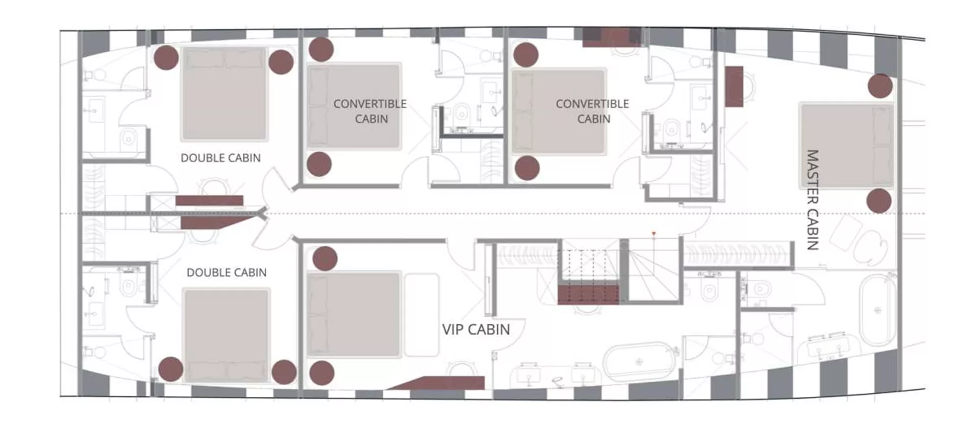 1x Full-beam Master cabin (king size bed, dimension 180x200cm) located forward at the lower deck,1x VIP Cabin (king size bed, dimension 180x200cm) located at the lower deck, starboard, 2x Double Cabins Aft each 18sqm (king size bed, dimension 180x200cm & 2x Convertible cabins each 15sqm (Queen size bed 160x 200, or 2 single twin beds) located at the lower deck, port side