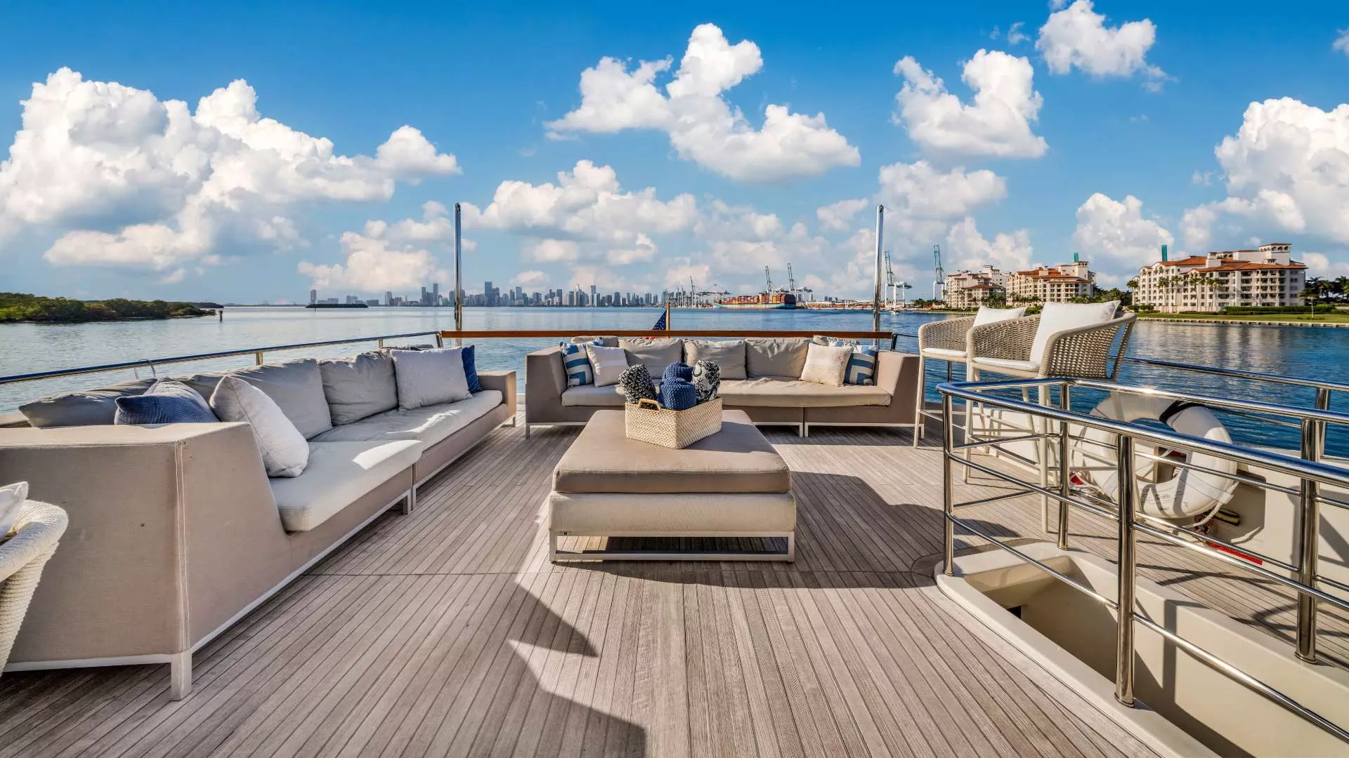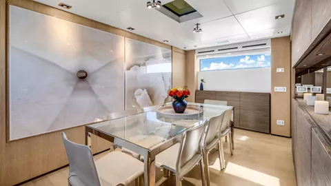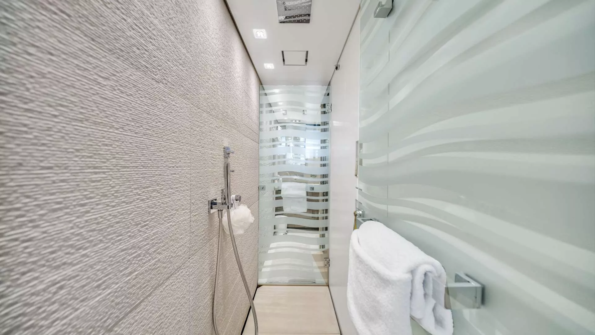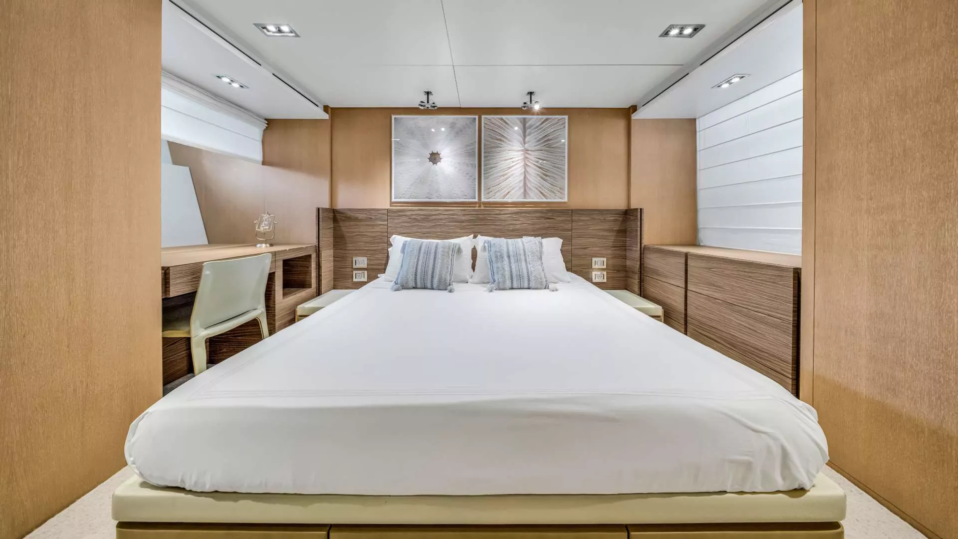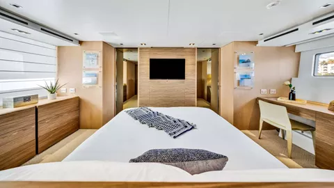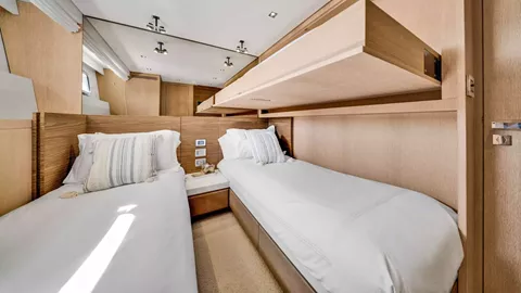 The four-stateroom layout comfortably accommodates up to ten guests, featuring a full-beam master suite, a spacious VIP cabin, and two twin guest cabins — each with its own private en-suite bathroom for the ultimate in privacy and comfort.