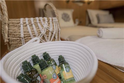 The interiors in elegant light and bright woods, make the boat modern and minimalist for a refined but yet informal clientele. At stern there is a large relaxation area with cushions, while other comfortable sunbathing cushions are available at bow. For an unforgettable cruise, Aegean Schatz also offers a wide range of water toys and entertainment for fun throughout the cruise.