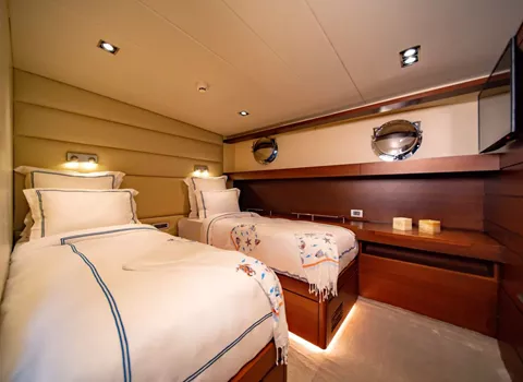 2 twin cabins : 2 m x 90 cm – Both cabins’ beds are convertible to doubles.
