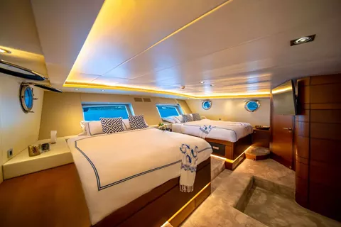 Accommodation is quite flexible and can be provided for up to 12 guests in 5 cabins by utlizing the 2 queen sized beds in the master cabin.