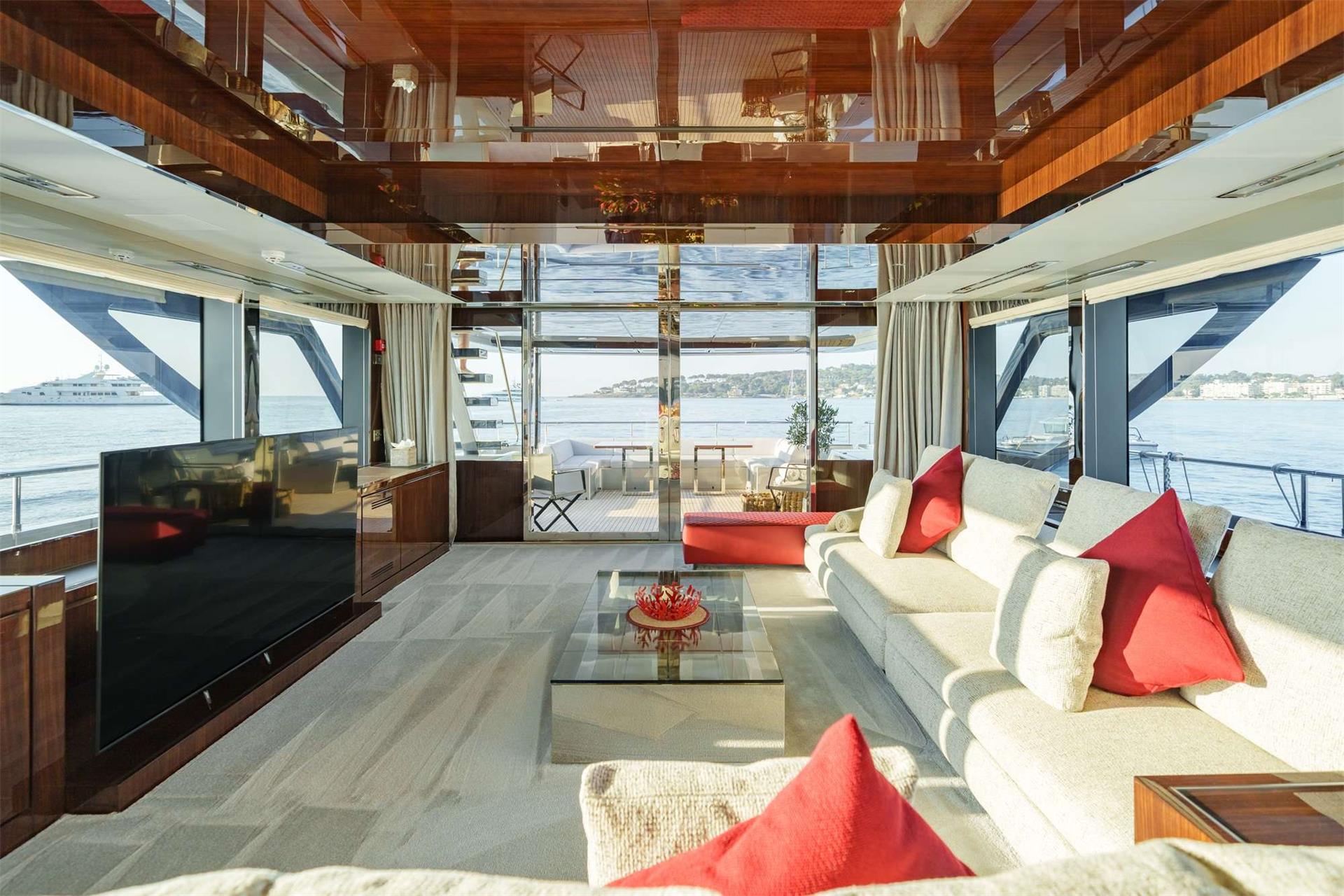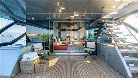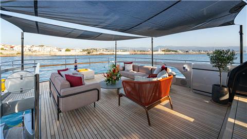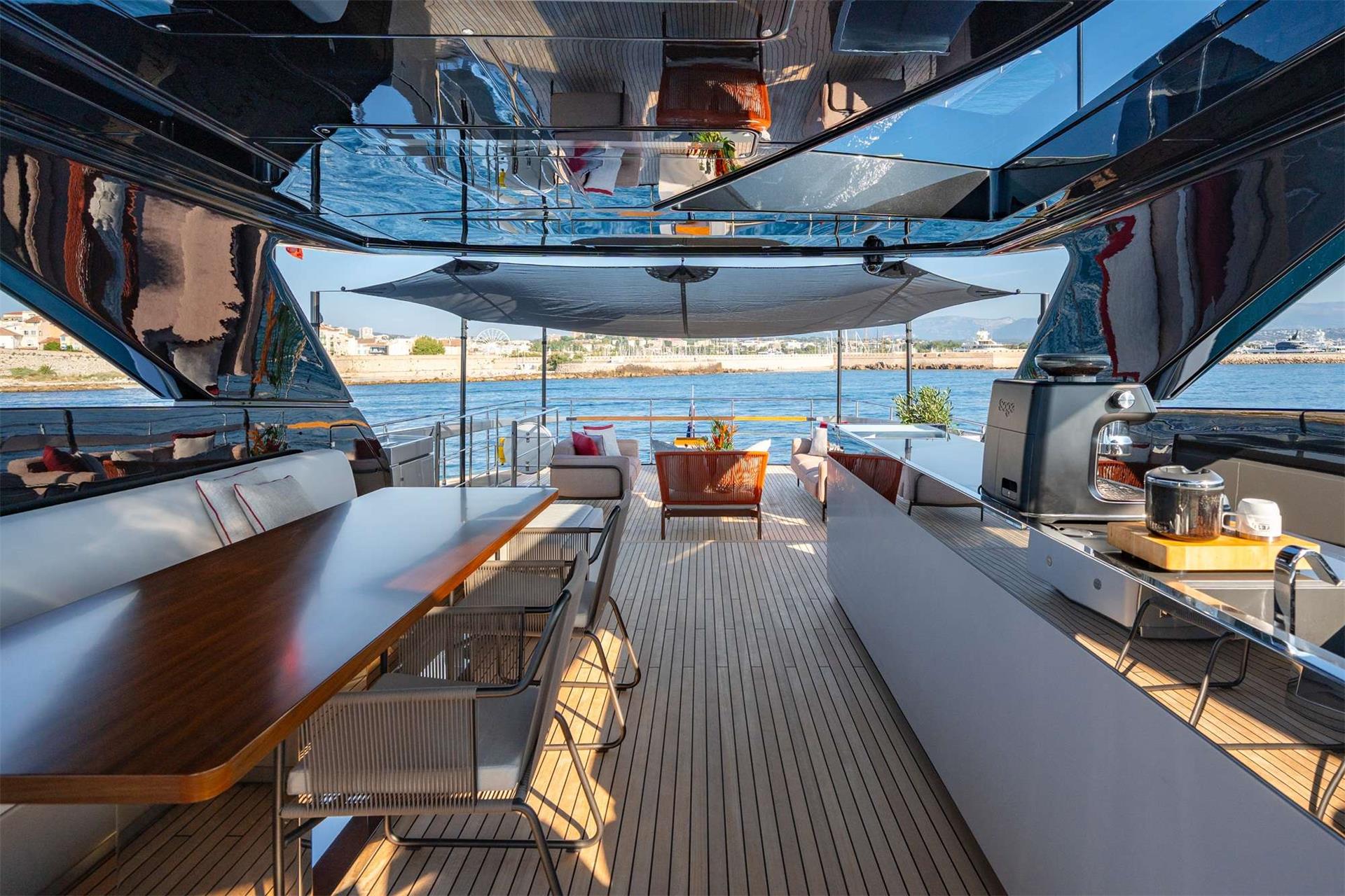 • Unique Fly bridge, featuring an ample sit down dining area, chique free-standing furniture/sofas & a full. professional linear bar set-up