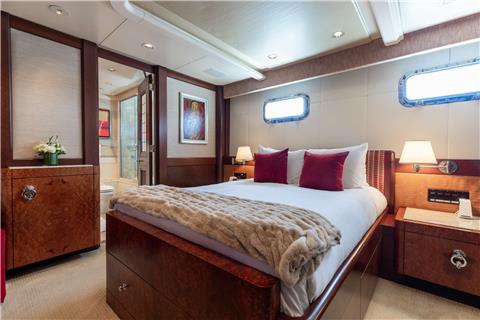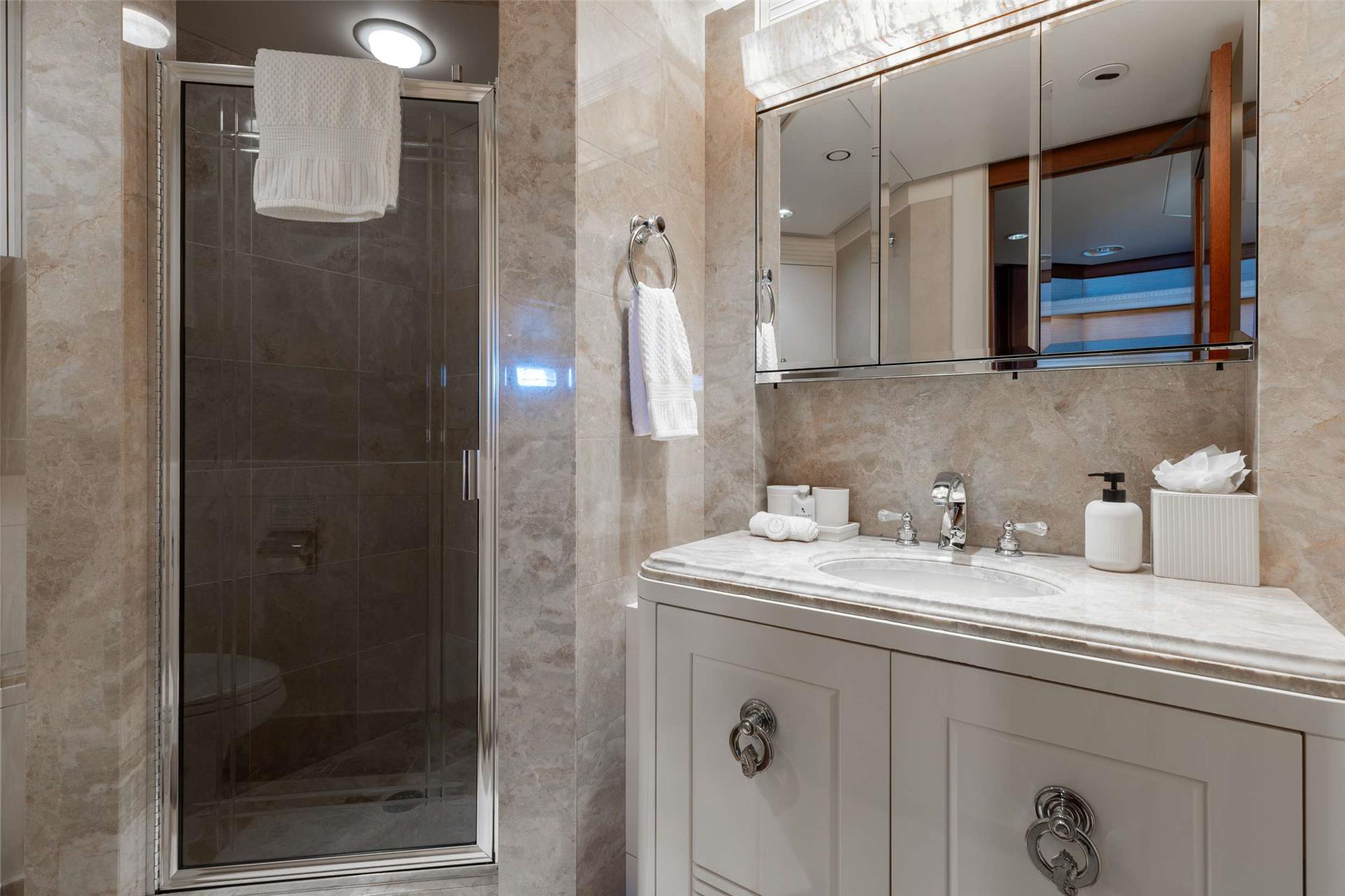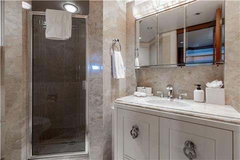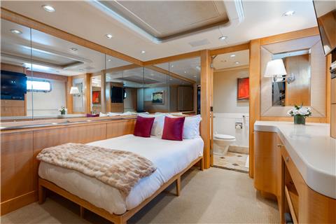 Master Stateroom on deck - walk around king size bed with master bathroom with large enclosed shower and double vanity.