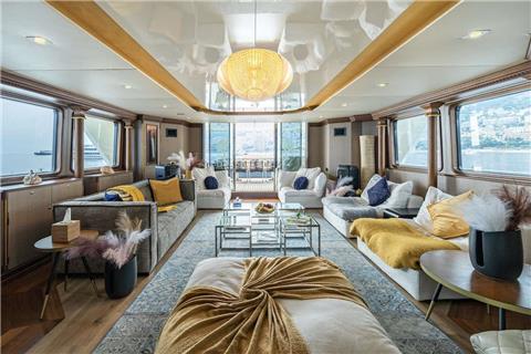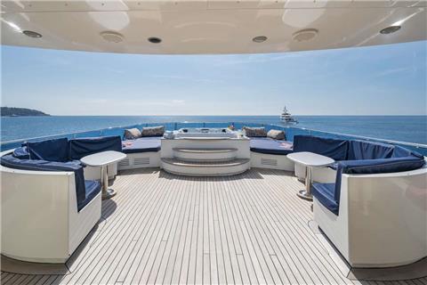 Her modern interior features a large salon, formal dining room, and office space, while outside, guests can relax on the expansive sundeck with lounge areas, a jacuzzi, and panoramic views.