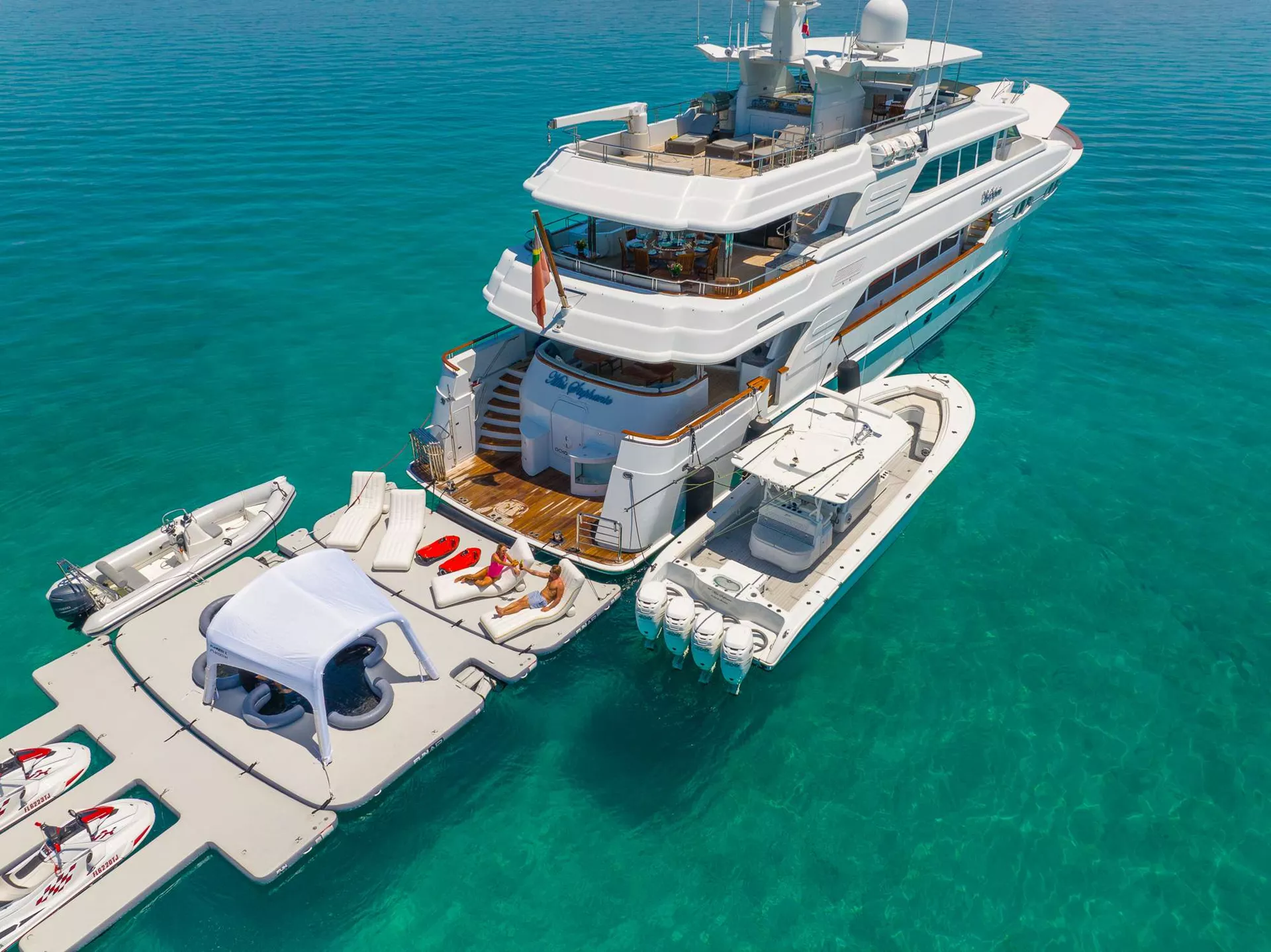 41’ Inflatable beach club, complete with shaded Cabana netted pool, loungers and jet ski docks