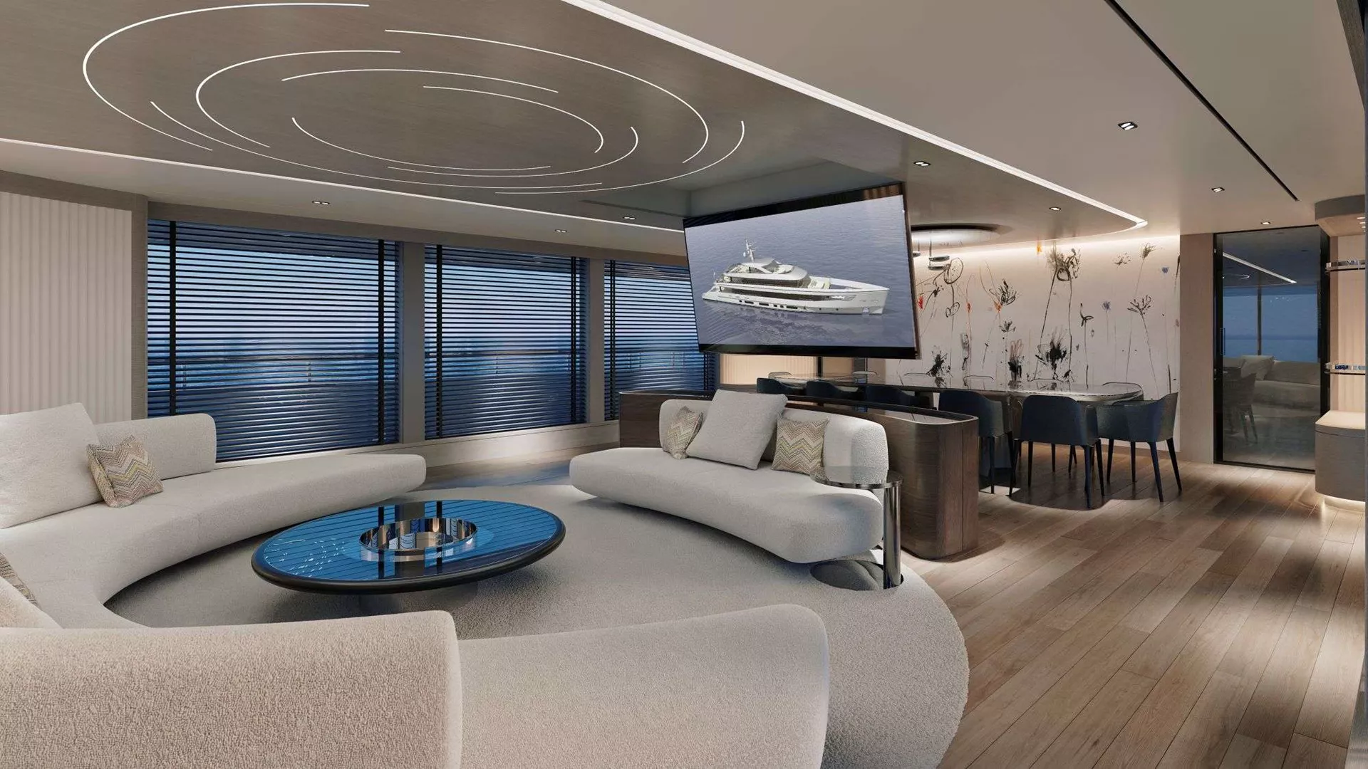 Guests are welcomed by a cozy seating area and a well-appointed bar, offering a seamless transition into the spacious main salon. Inside, a large, comfortable lounge area is complemented by a main dining table, perfect for relaxed or formal gatherings. A sliding door connects this space to the crew and galley area, ensuring smooth and efficient service.