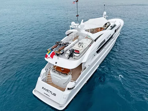 Refitted in 2021, INVICTUS combines sleek exterior lines with a warm and elegant Nuvolari-Lenard interior, blending rich hardwoods, Italian fabrics, and stylish furnishings. She accommodates up to eight guests in four luxurious staterooms, including a spacious on-deck master suite with a king-size bed, generous storage, and an en suite bathroom. A full-beam VIP stateroom below deck offers equal levels of comfort, while two additional queen staterooms ensure every guest enjoys their own private retreat.