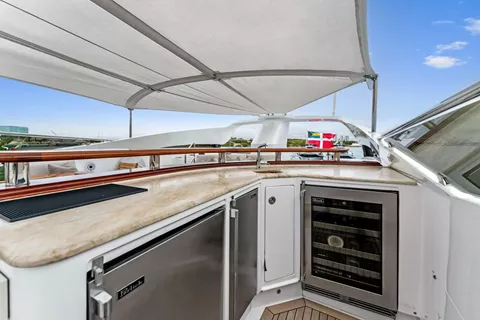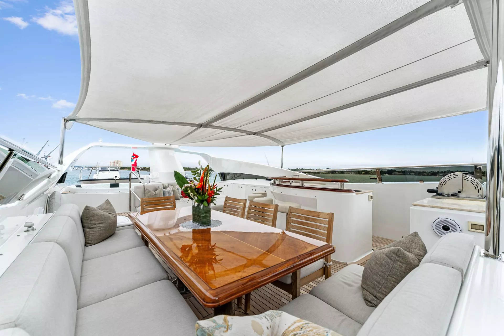 The sundeck is a guest favorite, featuring a Jacuzzi, sun loungers, wet bar, BBQ, and plenty of shade for daytime comfort. Whether you’re basking in the sun or dining under the stars, this versatile space sets the stage for memorable moments.