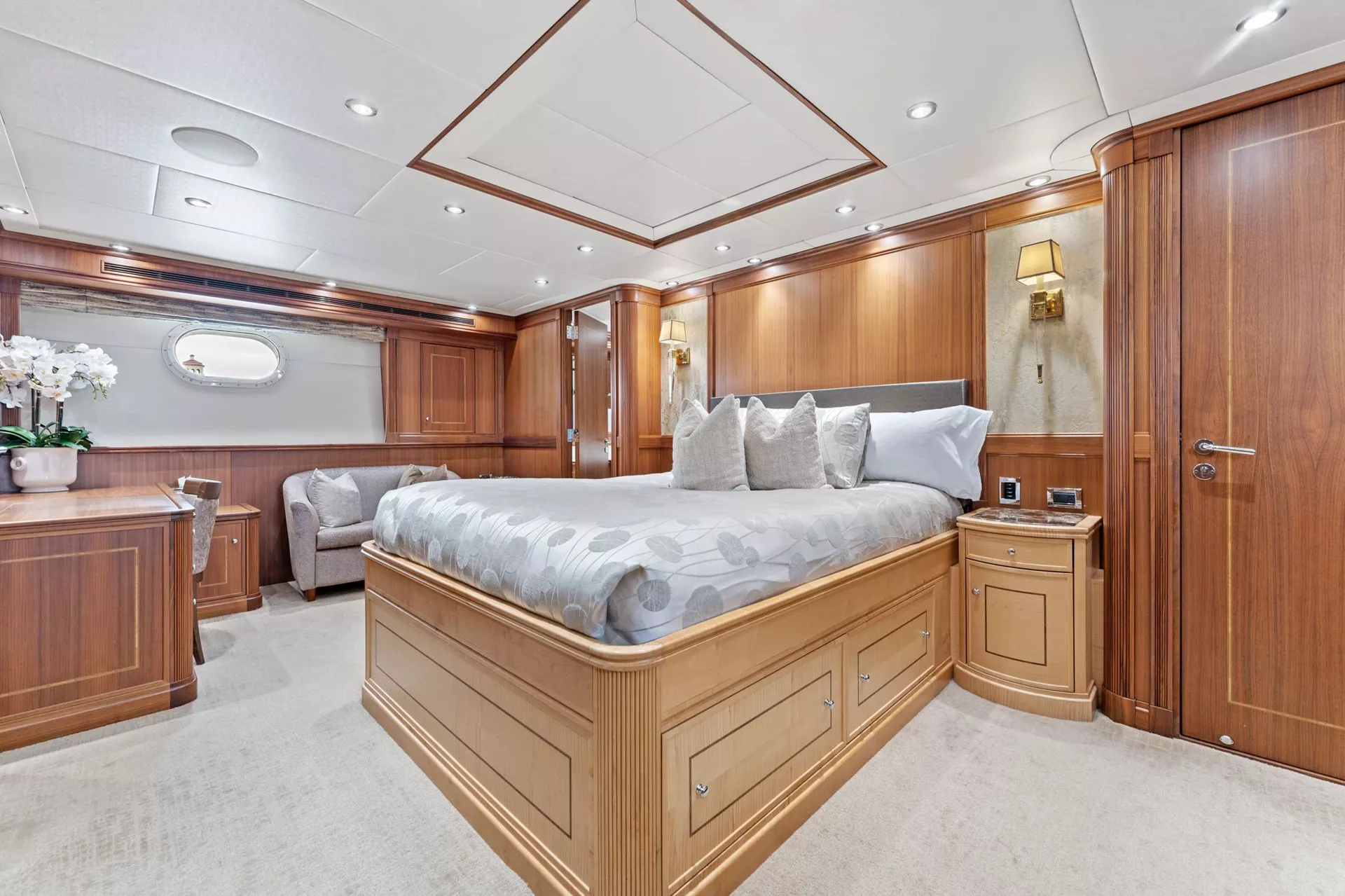 The Main deck master stateroom utilizes sapce efficiently, featuring a king-sized bed, generous his and hers cedar wood closets, a sofa, a writing deck, and an en-suite bathroom. The VIP stateroom, or second master, is located below deck and offers similar levels of comfort with a full beam configuration. The two guest staterooms forward provide queen-size beds, spacious en-suite bathrooms, and ample closet space