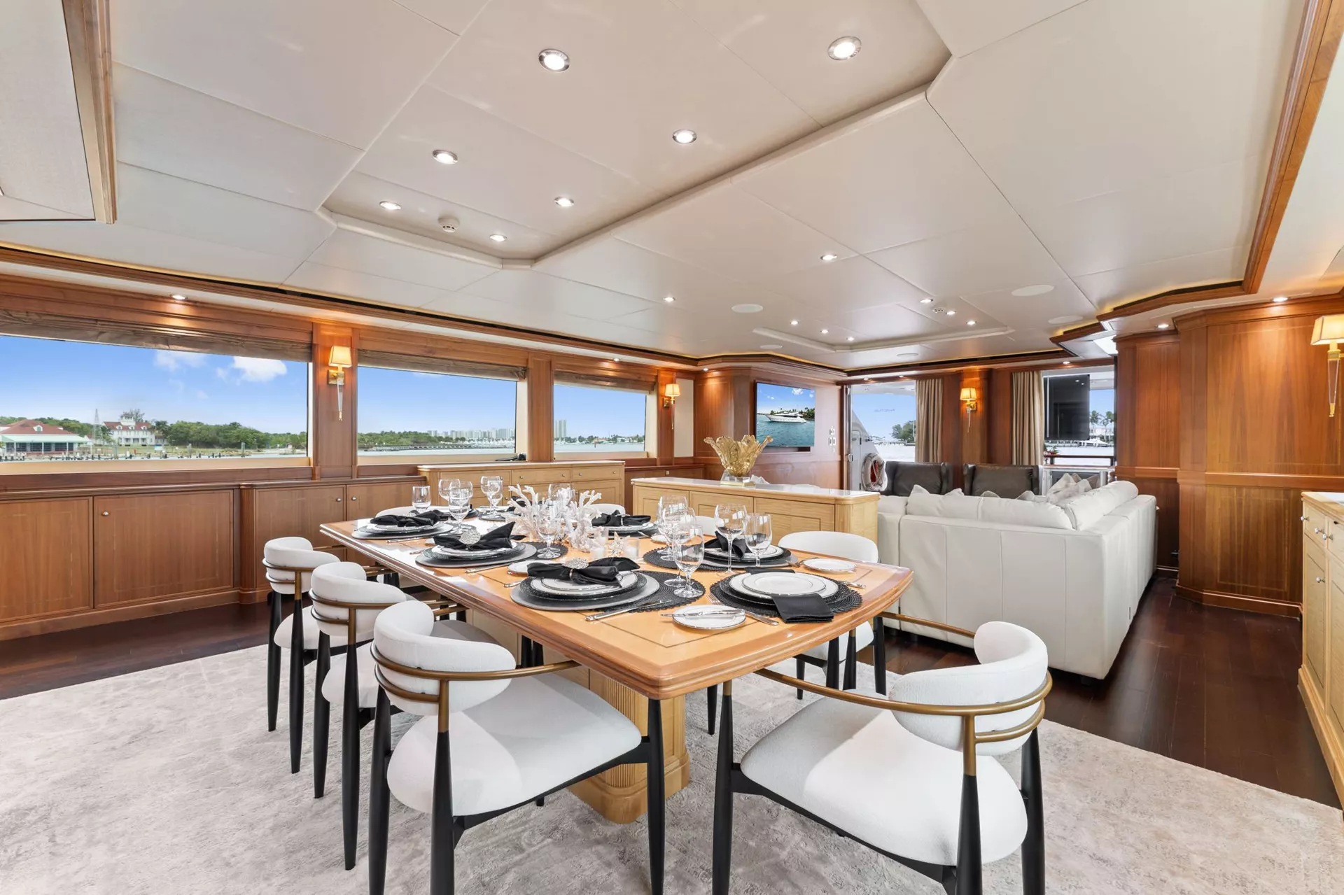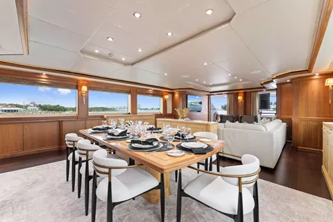 Life onboard is all about effortless entertaining and relaxation. The main salon flows into a formal dining space for eight, while alfresco dining options on the main deck aft and sundeck make the most of spectacular views. Evenings can be spent enjoying cocktails at the outdoor bar, catching a movie on one of the flatscreens, or simply soaking in the atmosphere.