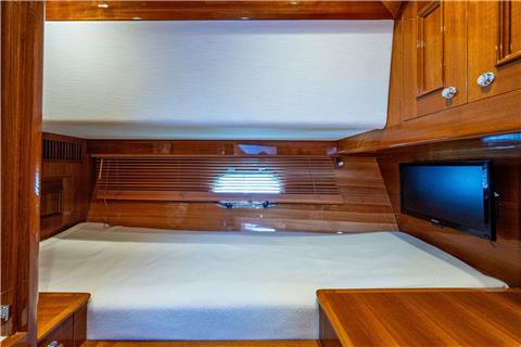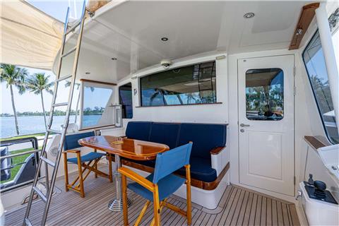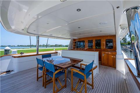 Outdoors, guests can savor alfresco meals on the aft deck beneath the shelter of the hardtop shade—an ideal spot for lingering over lunch with sea breezes drifting by. Above, the cozy flybridge invites relaxation with deep blue Sunbrella cushions, varnished teak trim, a barbecue for casual grilling, and sun loungers positioned for soaking in panoramic views.