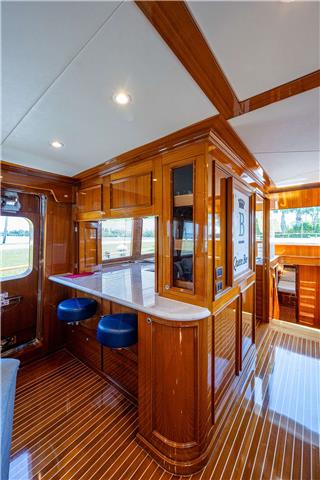 The spacious open-plan saloon aboard MAGIC TUTCH is warm and inviting, framed by beautifully varnished teak cabinetry and a softly lit teak staircase that sweeps up to the flybridge. Plush seating wraps the room, creating an effortless flow for conversation, while a marble-topped breakfast bar with swing-out stools offers the perfect perch for morning coffee or evening cocktails.