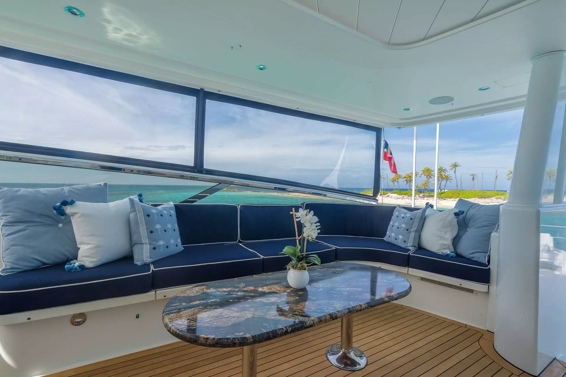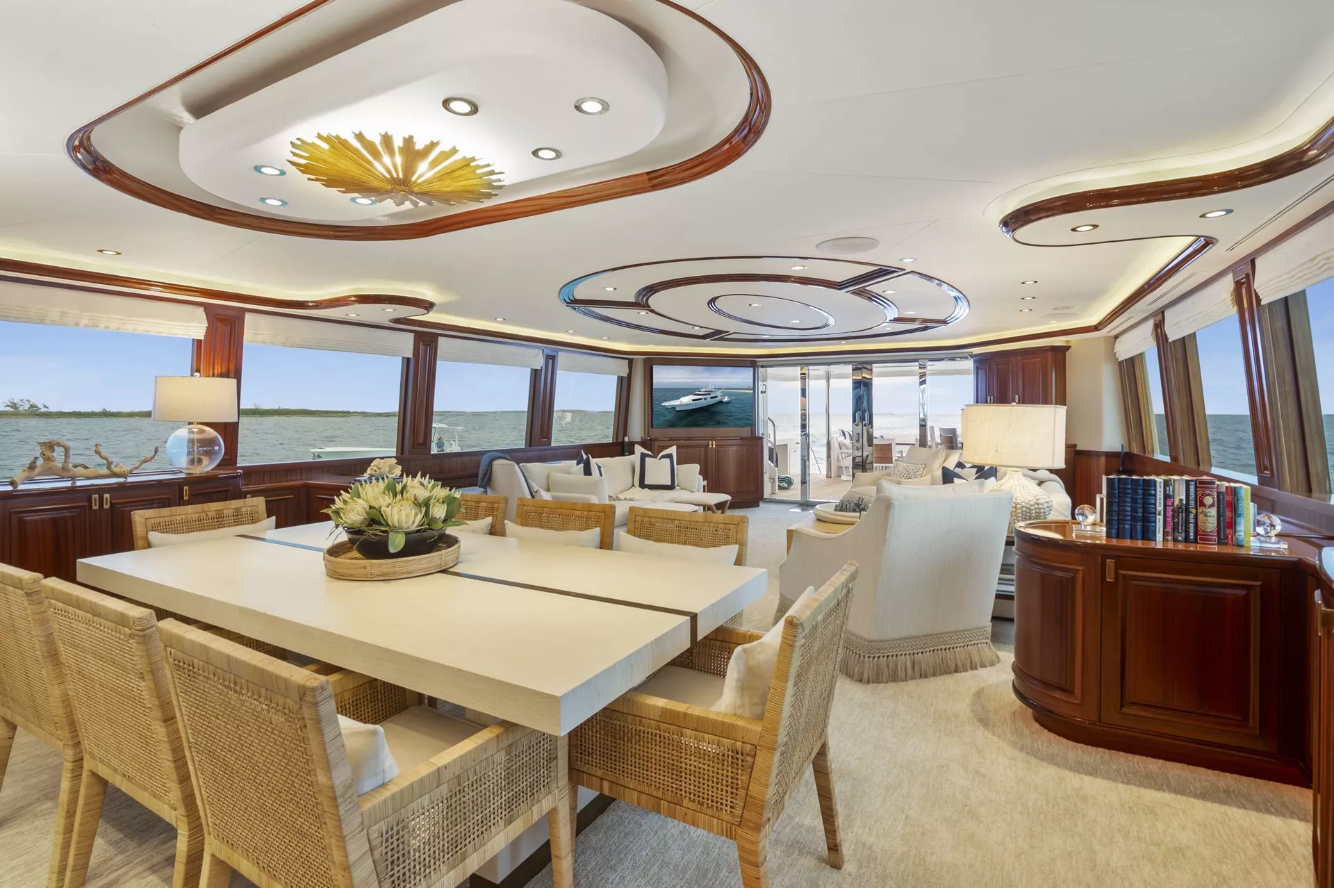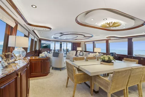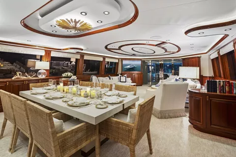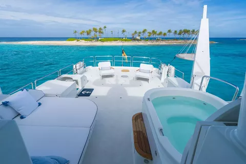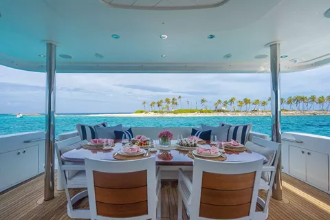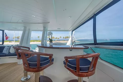 Outdoors, BETH ANN truly shines. The spacious flybridge is a guest favorite, featuring a custom hardtop, Jacuzzi, wet bar, and large dining area for al fresco meals. The aft deck is perfect for casual lounging or sunset cocktails.