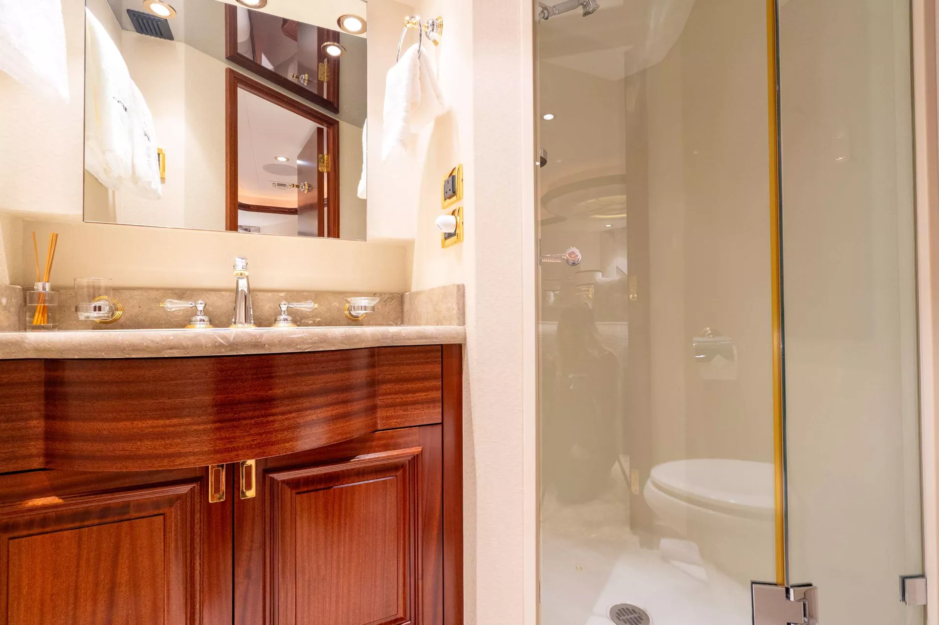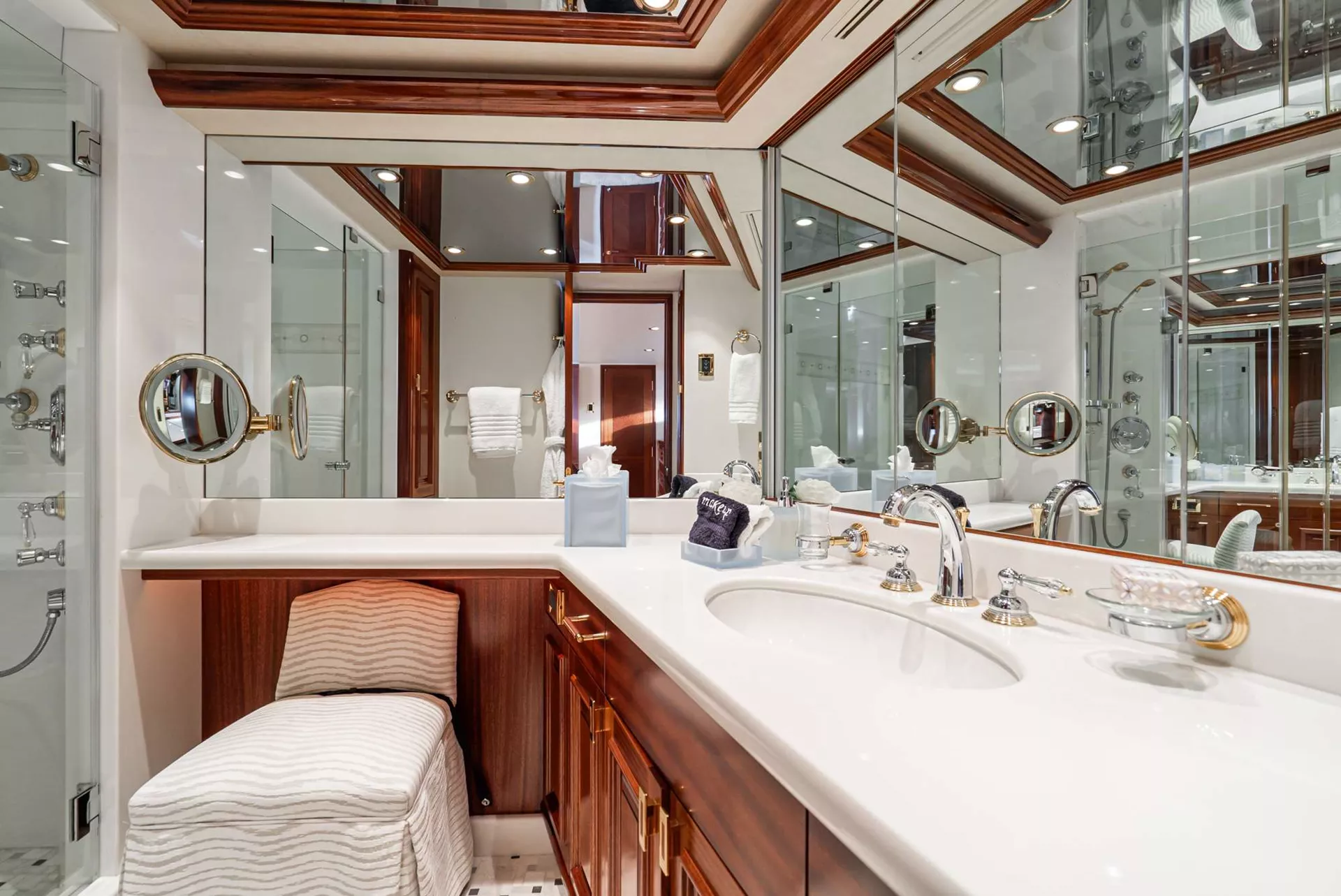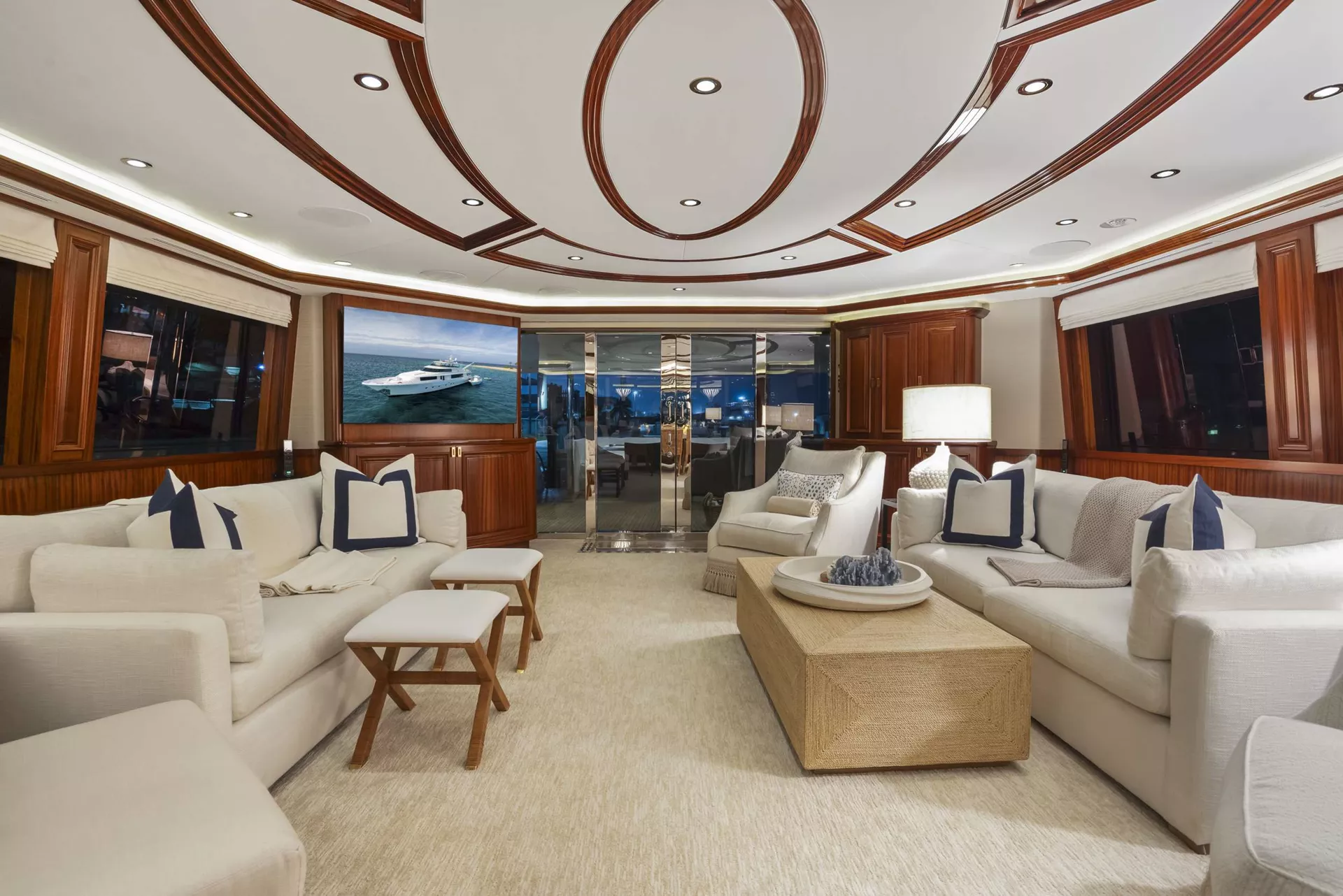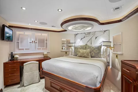 Her four-cabin layout sleeps up to eight guests in total comfort, featuring a full-beam master suite with a king bed and walk-in wardrobe, two queen cabins, and a forward VIP past the country kitchen. Each cabin includes its own en suite and entertainment system.