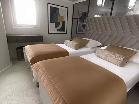 11 Double cabins with double bed and private balcony. Private bathroom with shower box and home type toilet.