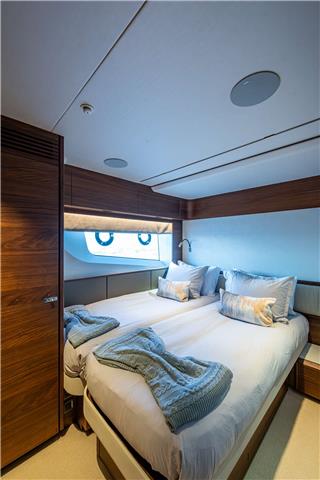 Below deck, forward there is a VIP stateroom with a double bed and walk-in closet
