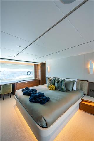 Located forward on the main deck, the Master Stateroom offers a luxurious retreat with a marine king bed, ample storage, and a dedicated dressing area featuring a full-length mirror, wardrobes, and a built-in safe. Additional amenities include a port-side dressing table, starboard seating area with sofa and coffee table.