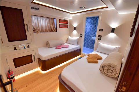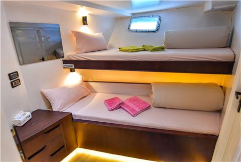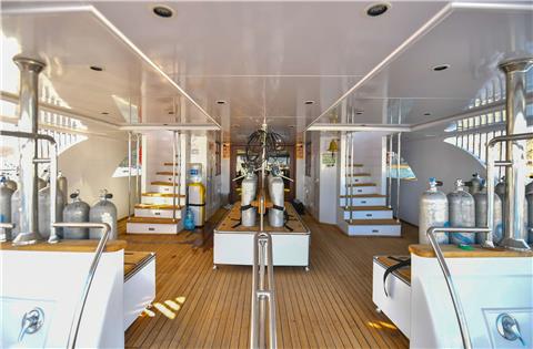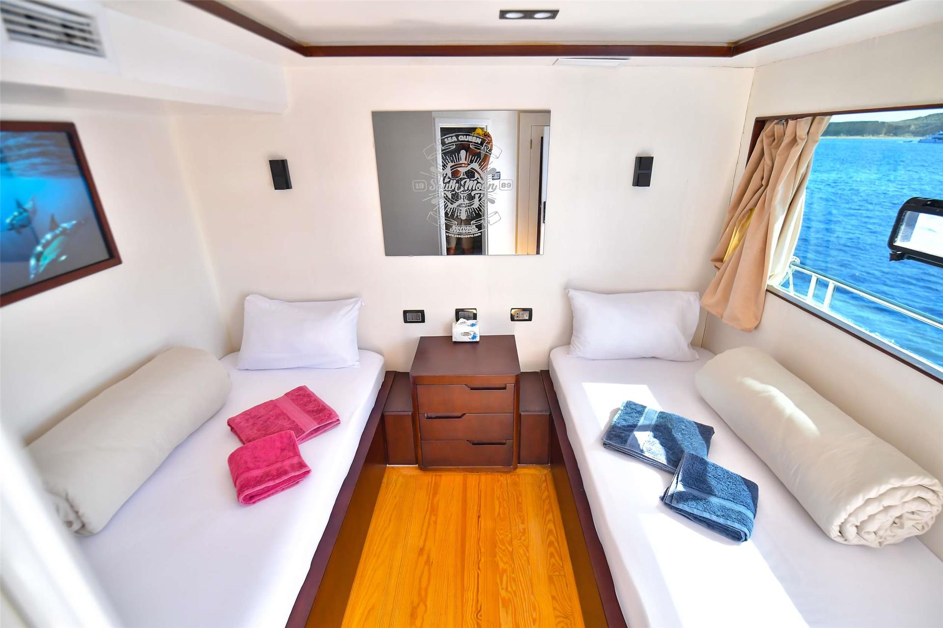 The yacht accommodates up to 20–22 guests in well-appointed cabins, each featuring air-conditioning and private en-suite bathrooms for maximum comfort throughout the voyage. Guests can relax in the air-conditioned salon and dining area, enjoy panoramic sea views from the upper deck lounge, or unwind on the spacious sun decks between dives.