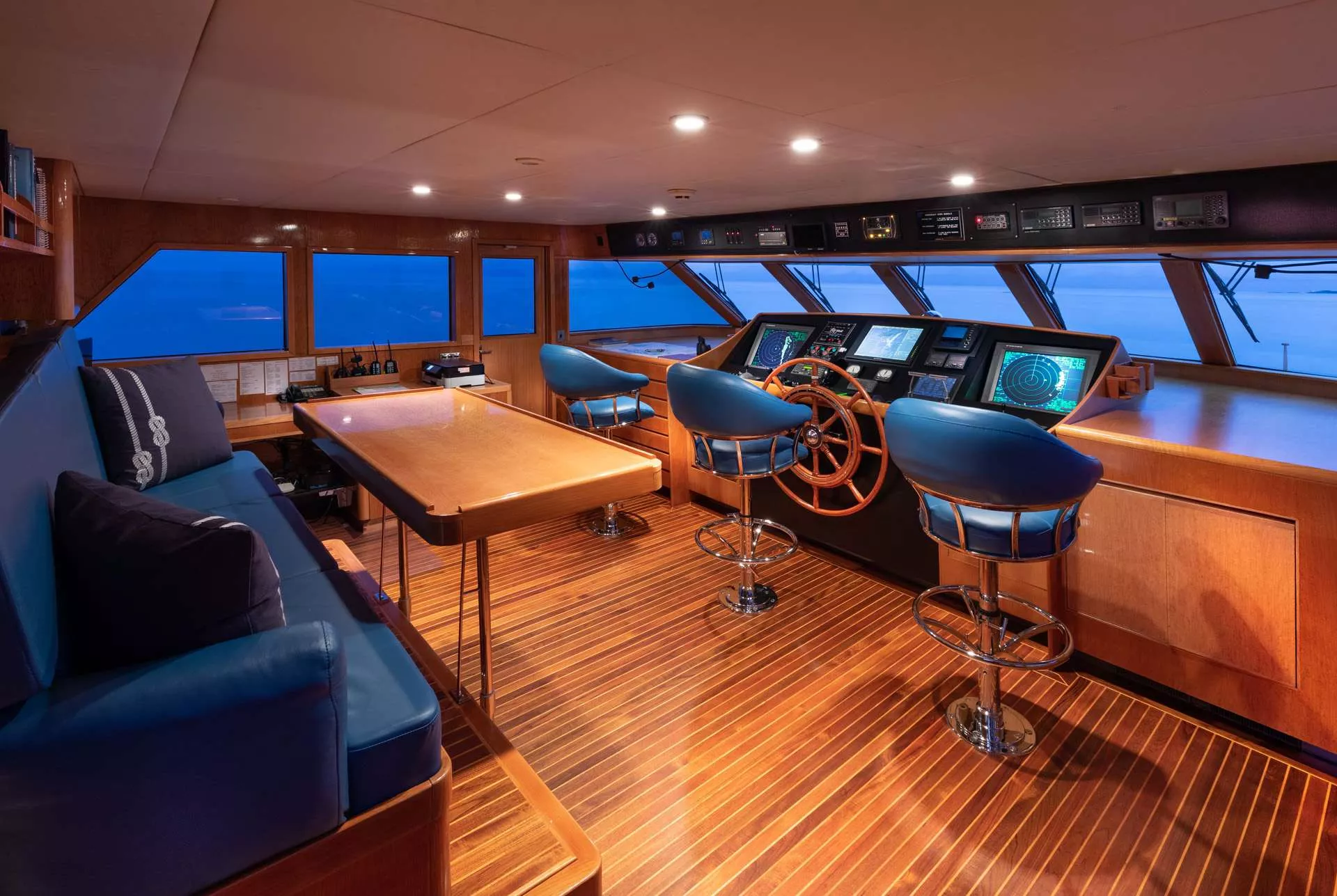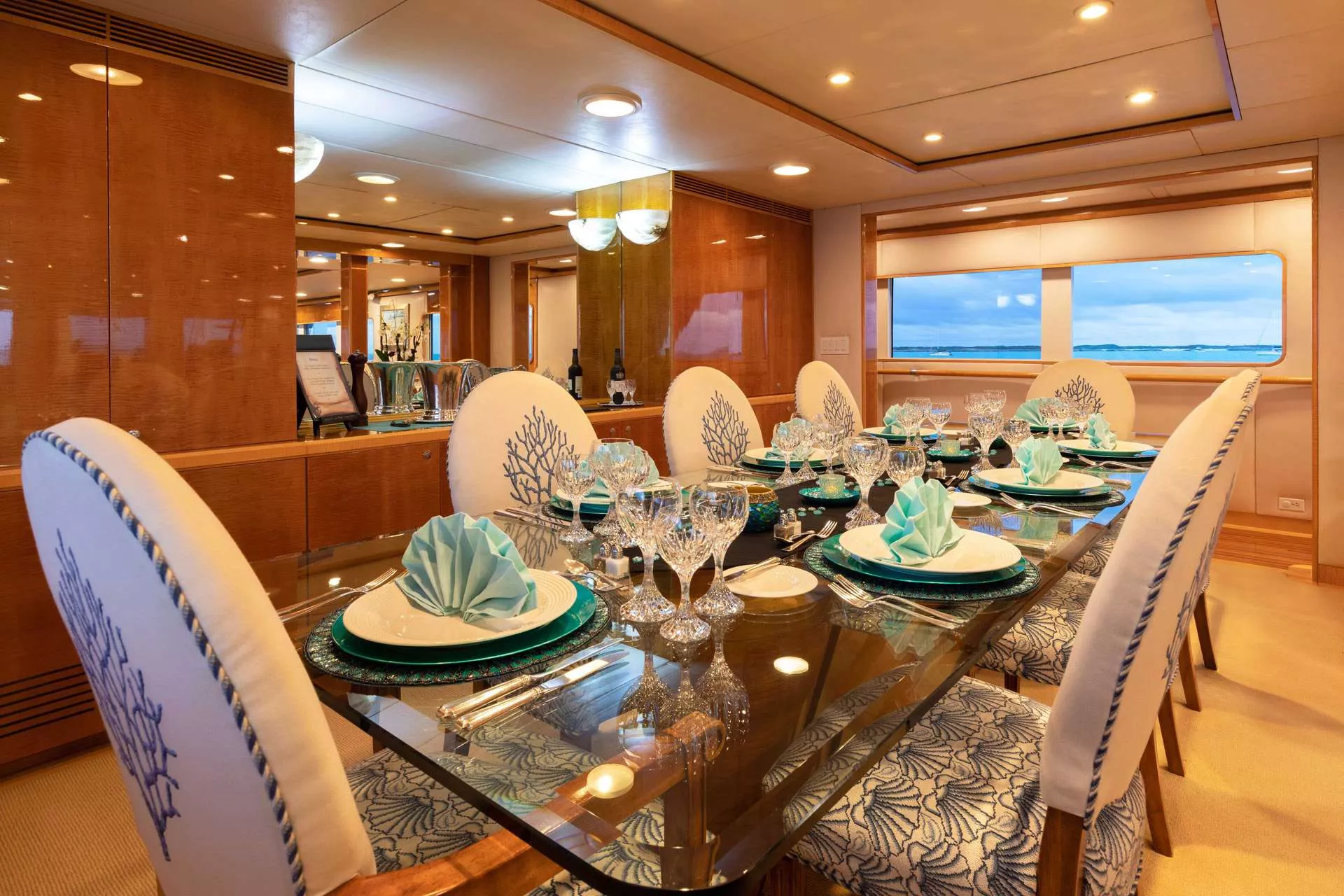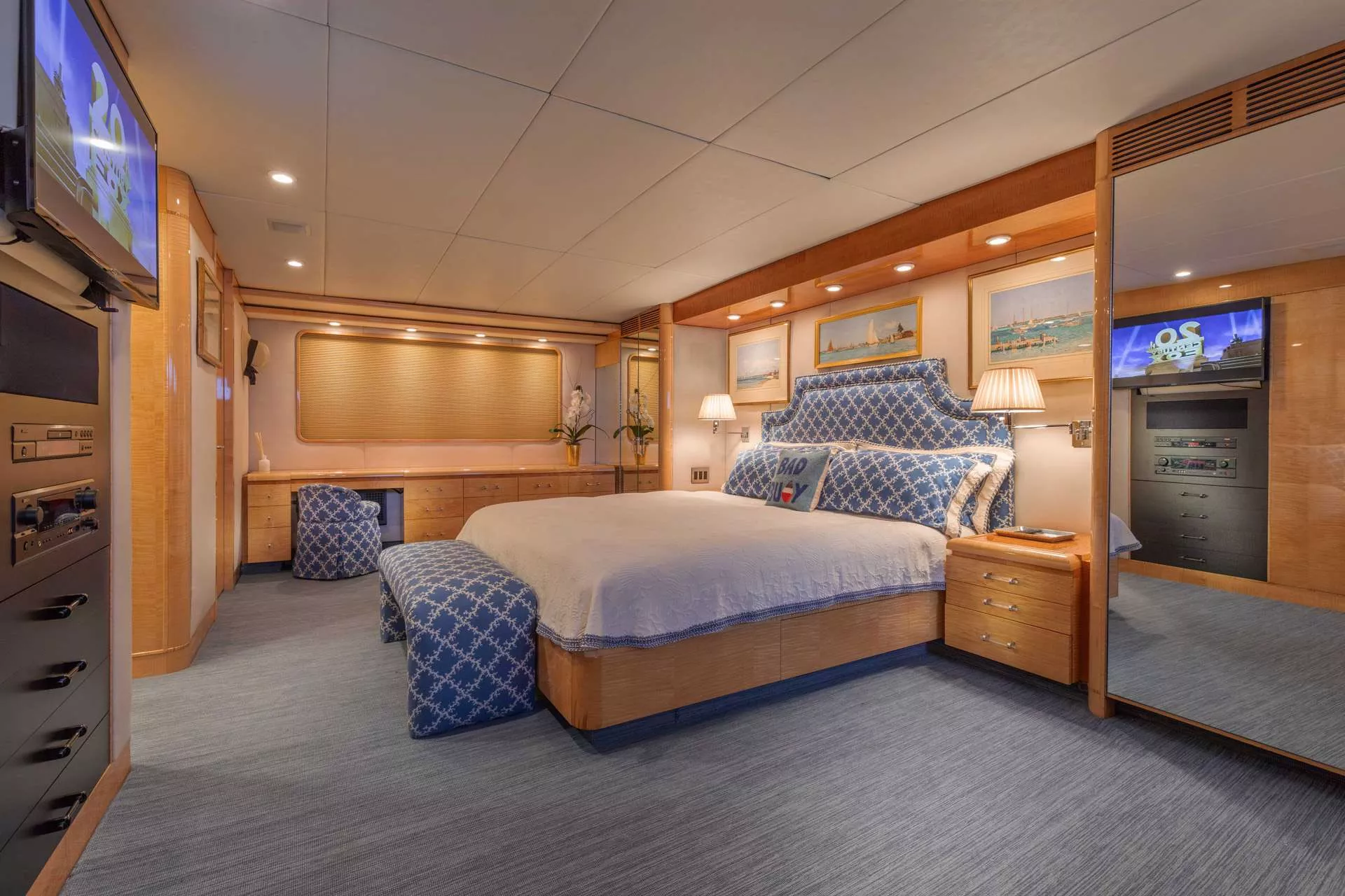 RENA accommodates 10-12 guests in five spacious staterooms each with ensuite bathrooms and state-of-the-art entertainment centers. Four are located on the lower level including a full-beam Master stateroom with a king-size bed and Jacuzzi tub as well as three guest staterooms. Each guest stateroom comes with queen and twin beds and Jacuzzi tubs while two of the guest rooms have Pullmans if needed. A spacious VIP stateroom with large windows is located on the main deck, featuring a king bed and Jacuzzi tub.