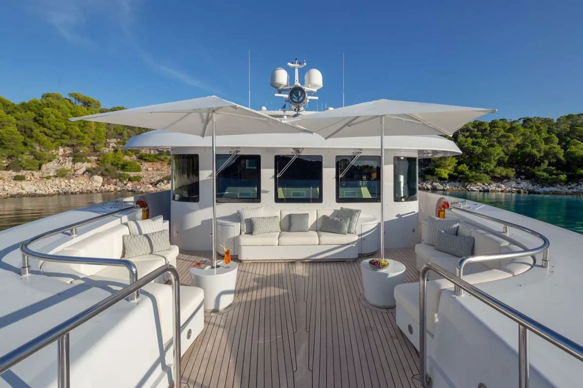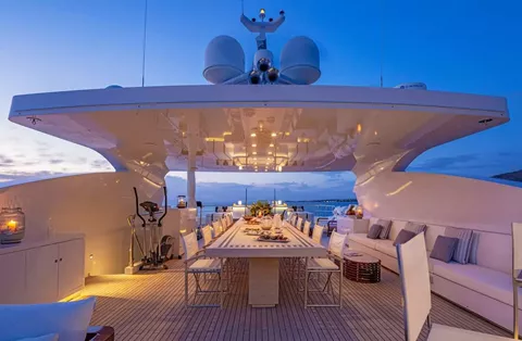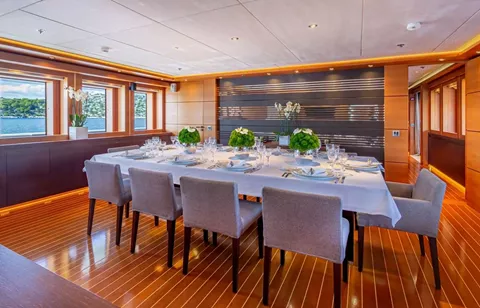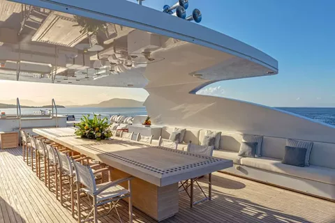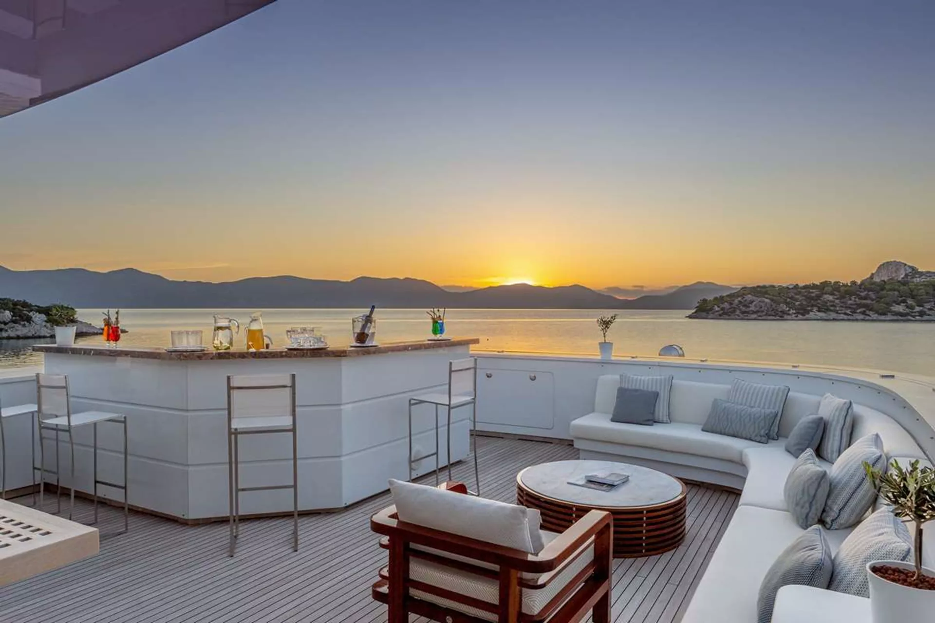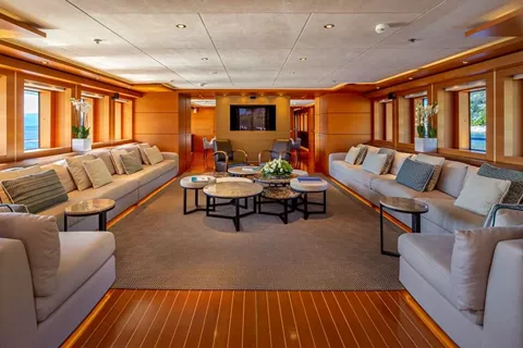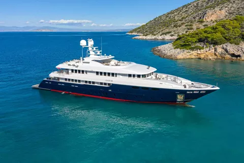 One of the few available 50 metres semi displacement aluminium yachts in the market with variable speed from 12 knots up to 22 knots.The choice of a contemporary, almost minimalist design contrasting with exquisitely tasteful furniture makes ZALIV III unique and original. Materials and colours of the interiors enhance the sense of space. The top deck is fitted with a large Jacuzzi along with TV on fly. She has been built with the most modern equipment (zero speed stabilizers, 3 large generators, special entertainment system and electrical curtains adjusted with the MAIN LUTRON MONITORING SYSTEM, special lighting design, special and extra insulating level, blue hull and many other features.
