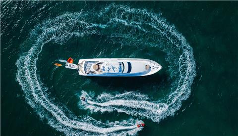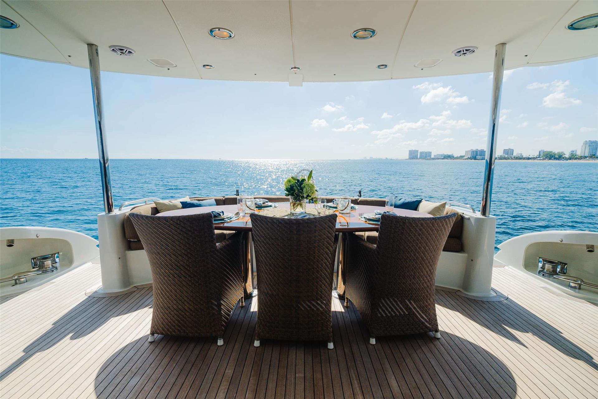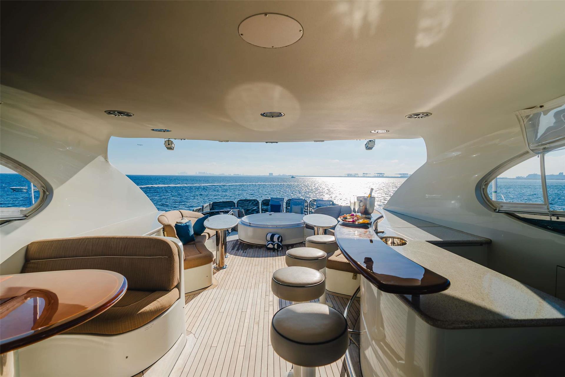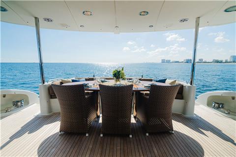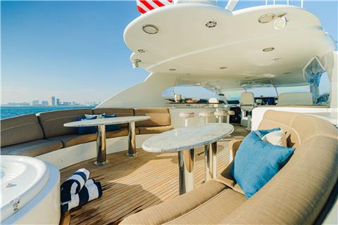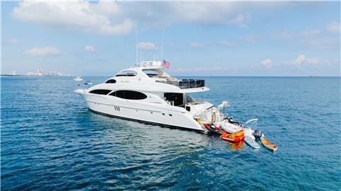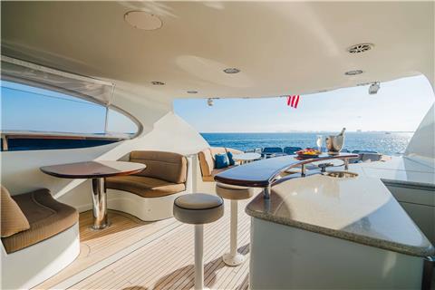 Curved double sliding doors open to the covered aft deck, which offers a wet bar, teak table, and seating. The foredeck offers a spacious sun lounge, while the flybridge has opposite-facing lounges with tables and a Jacuzzi. A stairway curves down from either side of the aft deck to the full-width swim platform. For those who enjoy watersports, CEDAR ISLAND offers a brand new (not shown in photos) 16-foot Zodiac tender with a 90 HP engine, water skis, two wave runners, tube, wakeboard, fishing gear, snorkeling gear, and rendezvous diving. CEDAR ISLAND is built with comfort and adventure in mind.
