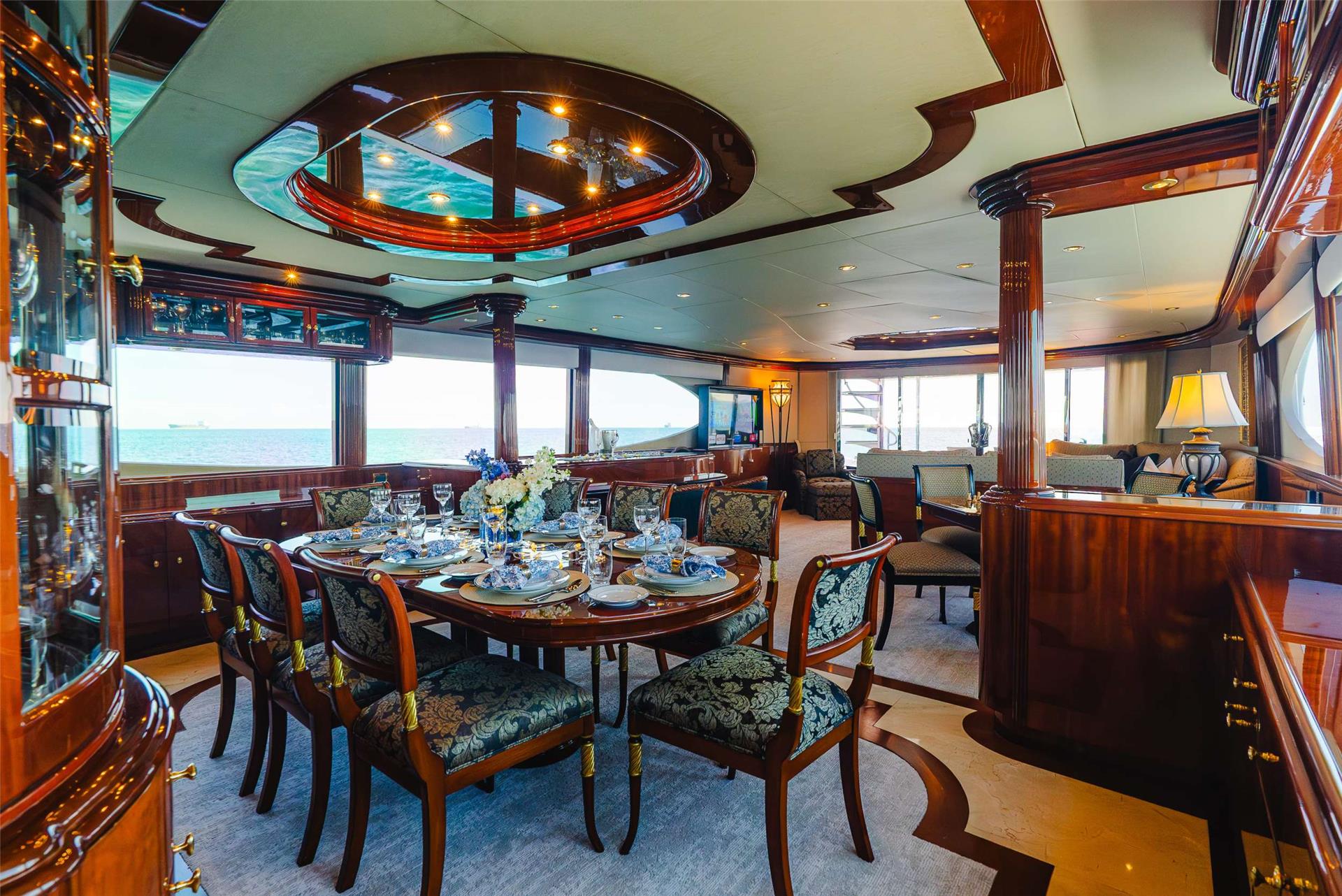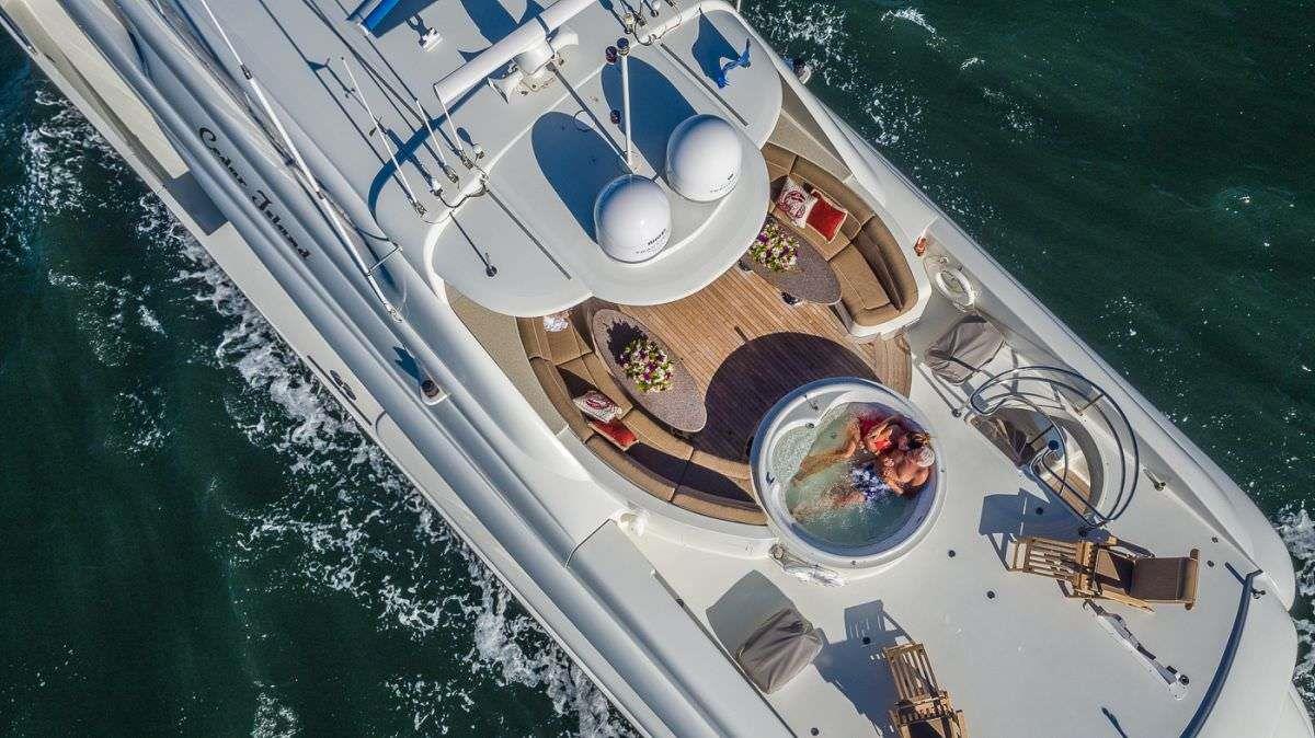 Performance engineering and detailed craftsmanship make CEDAR ISLAND an excellent charter experience. A well-designed layout comfortably sleeps 8 guests in 4 cabins with a large master suite and three VIP staterooms. The interior is finished in custom high-gloss African cherry wood as a spacious main salon boasts comfortable social areas, formal dining for 8, a game table, and a serving bar complete with ice maker and wine cooler.