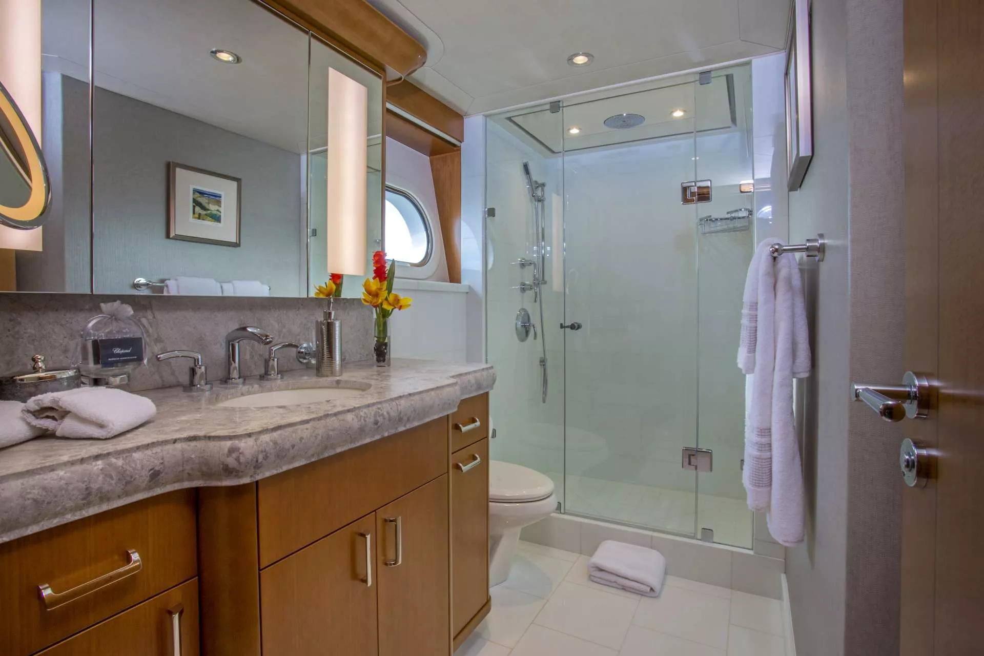 VIP Stateroom (2): Midships, lower deck to starboard: Centerline king bed with two night stands, dresser, safe, and closet. The en-suite features a head and bidet, twin sinks and a shower. The entertainment center has a 32” Blu-ray TV, DVD/CD, iPod dock, and surround sound.