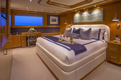 VIP Stateroom (1): Midships, lower deck to port: Centerline king bed with two night stands, dresser, safe, and closet. The en-suite features a head and bidet, twin sinks and a shower. The entertainment center has a 32” Blu-ray TV, DVD/CD, iPod dock, and surround sound.