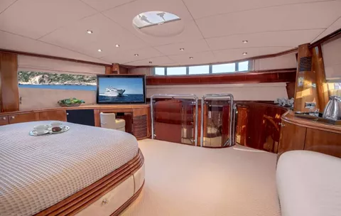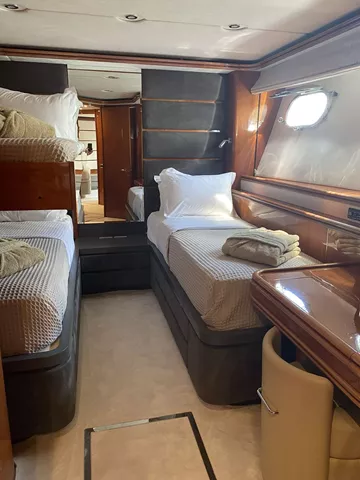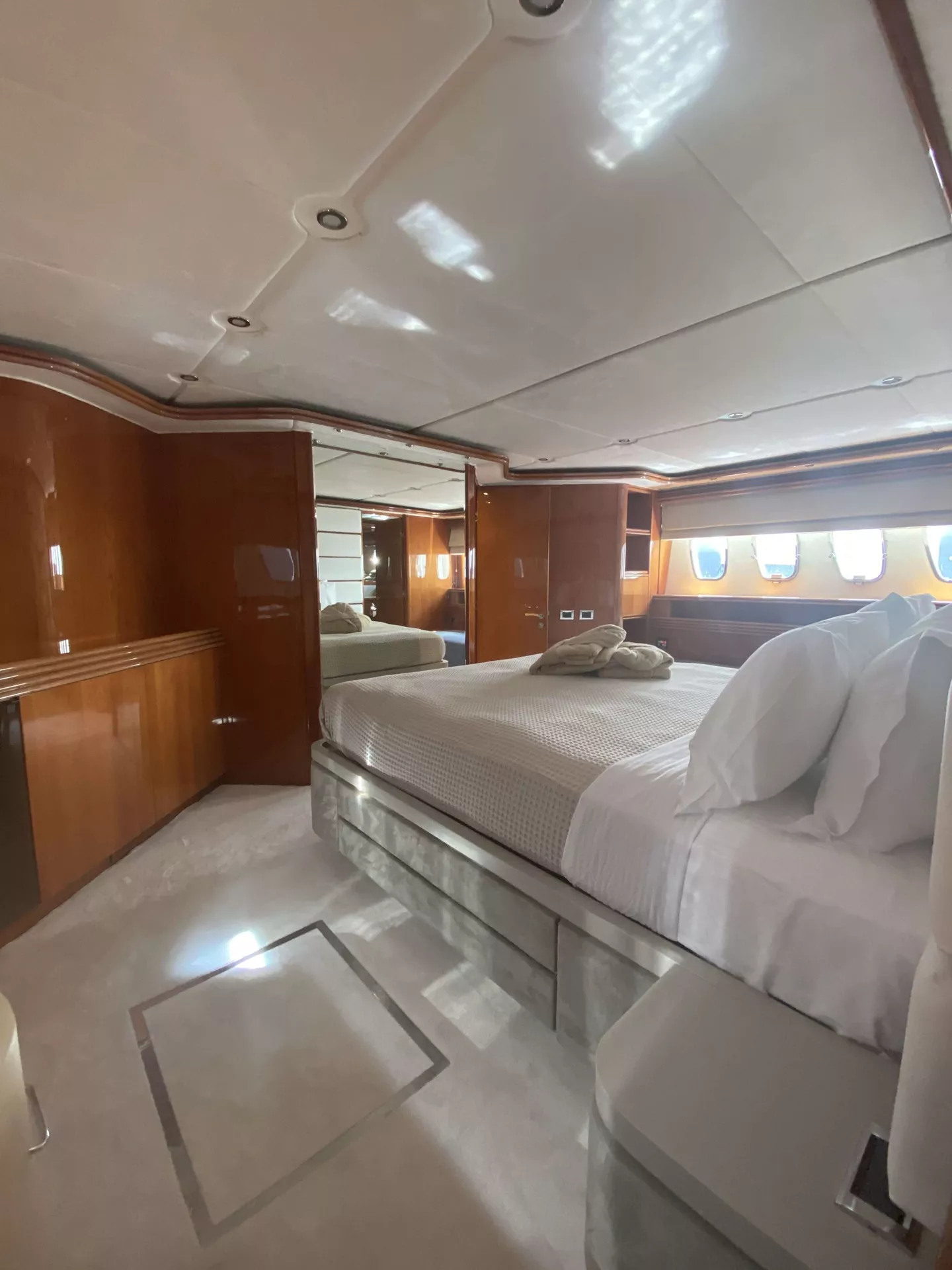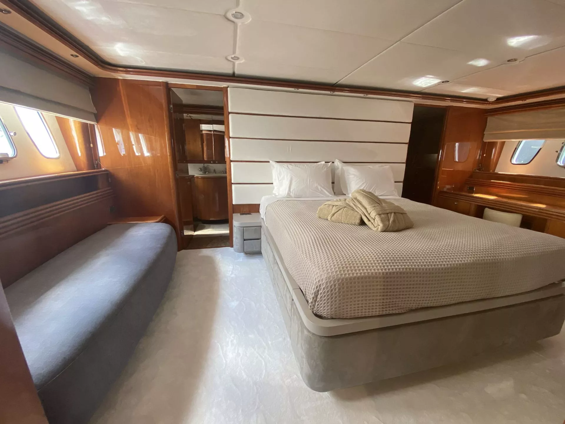 1 large 3 level Master stateroom on the Main Deck with mid level dressing area with separate toilet room and an open bathroom on the lower level with tub and his & hers sinks.