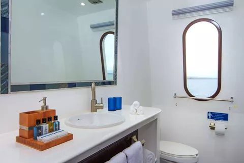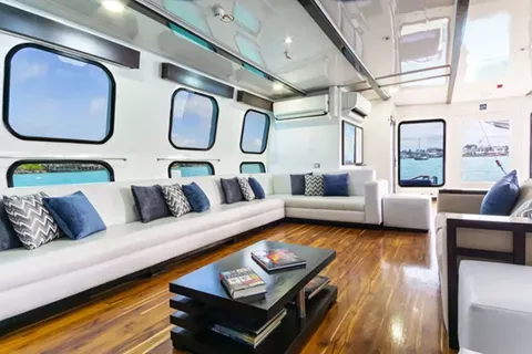 This intimate ship can comfortably hold up to 16 passengers on 8, 5, and 4-day Galapagos tours. Travelers will enjoy every part of their trip with gorgeous views from the sundeck with a jacuzzi, delicious meals in the barbecue and al fresco dining areas, and a safe internal staircase.