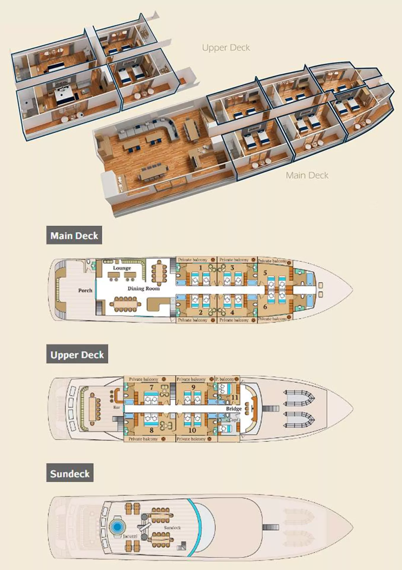Upper Deck: 2 double cabins (247.5ft² / 23m²), 2 double Suites (360.6ft² / 33.5m² and 376.7ft² / 35m²).