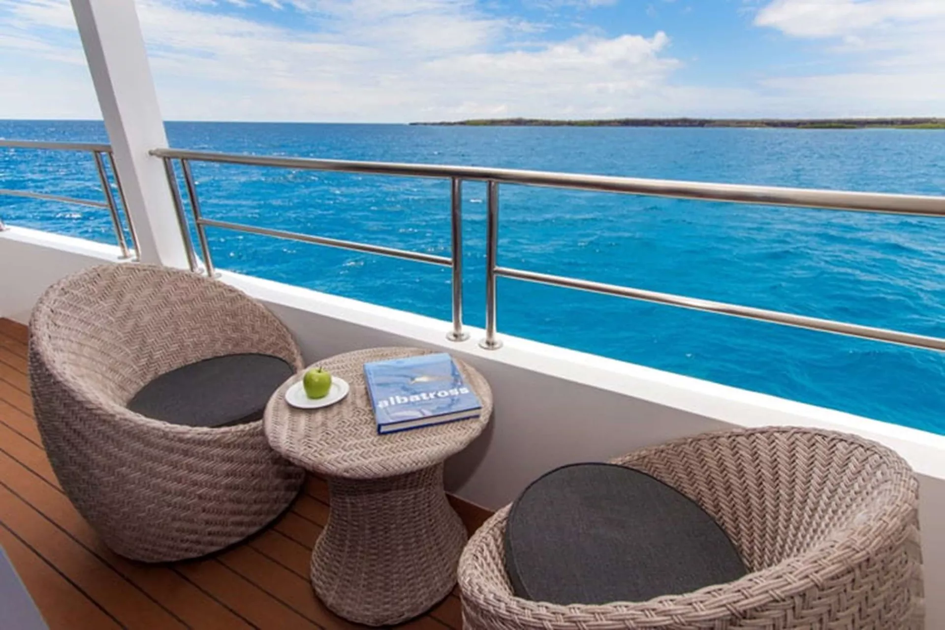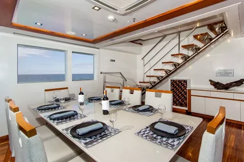 Outside dining and bar and also a solarium allow you to cruise the Galapagos in tremendous style and sumptuous luxury. All eight cabins and two suites have private balconies.